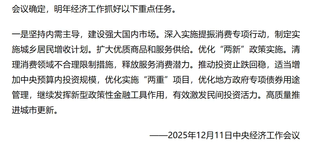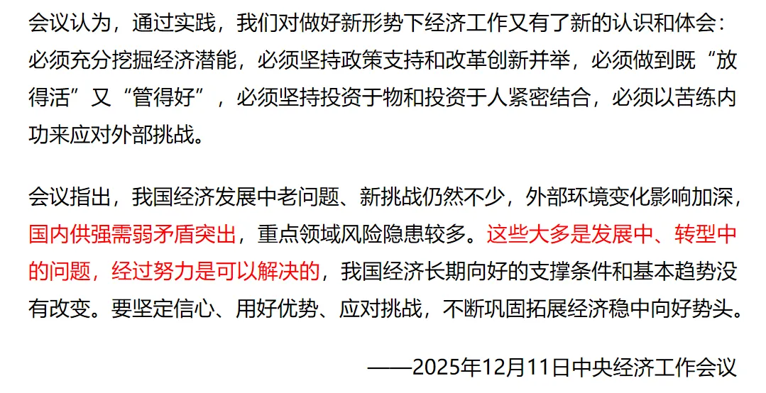 在这一连串动作之后,到了25年12月的最高层会议时,语调和方向就有了新的表述,对外部环境的表述,已经从之前的“动荡不安”(22年12月),“复杂性、严峻性、不确定性上升”(23年12月),转变为相对比较中性的“变化影响加深”(25年12月)