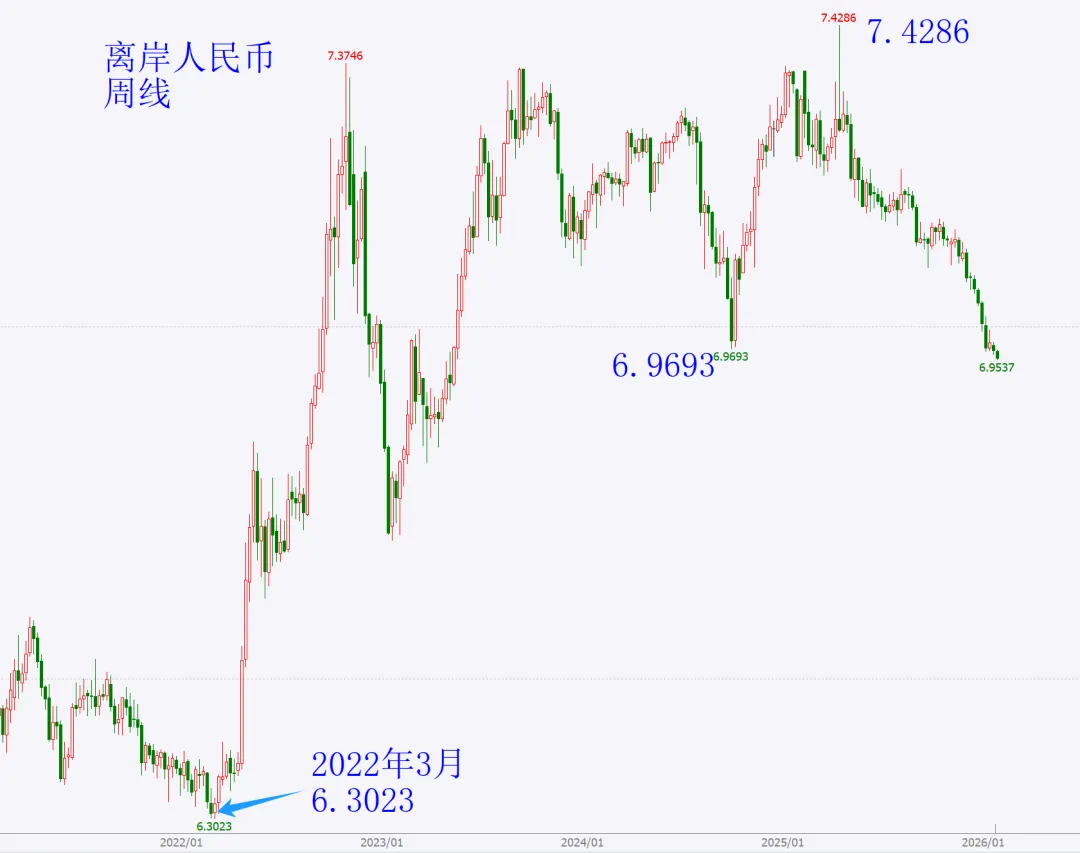 这张是离岸人民币的周线走势图,可以看到,离岸人民币已经升破了24年9月底政策逆转后的6.9693
