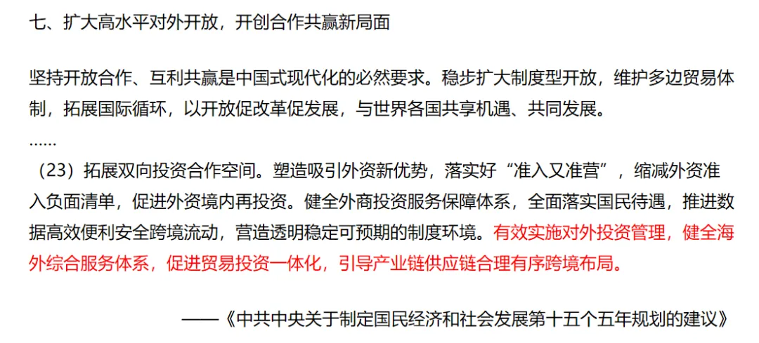 在“十五五”规划中就提到:“有效实施对外投资管理,健全海外综合服务体系,促进贸易投资一体化,引导产业链供应链合理有序跨境布局。”