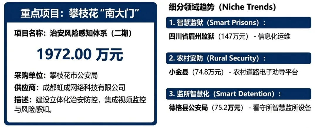核心内容:“天网工程”进入运维期和升级期。例如,阿坝县公安局的天网一至四期运维服务(988万元),以及南充市公安局的视频专网配套设施建设(2843万元)。