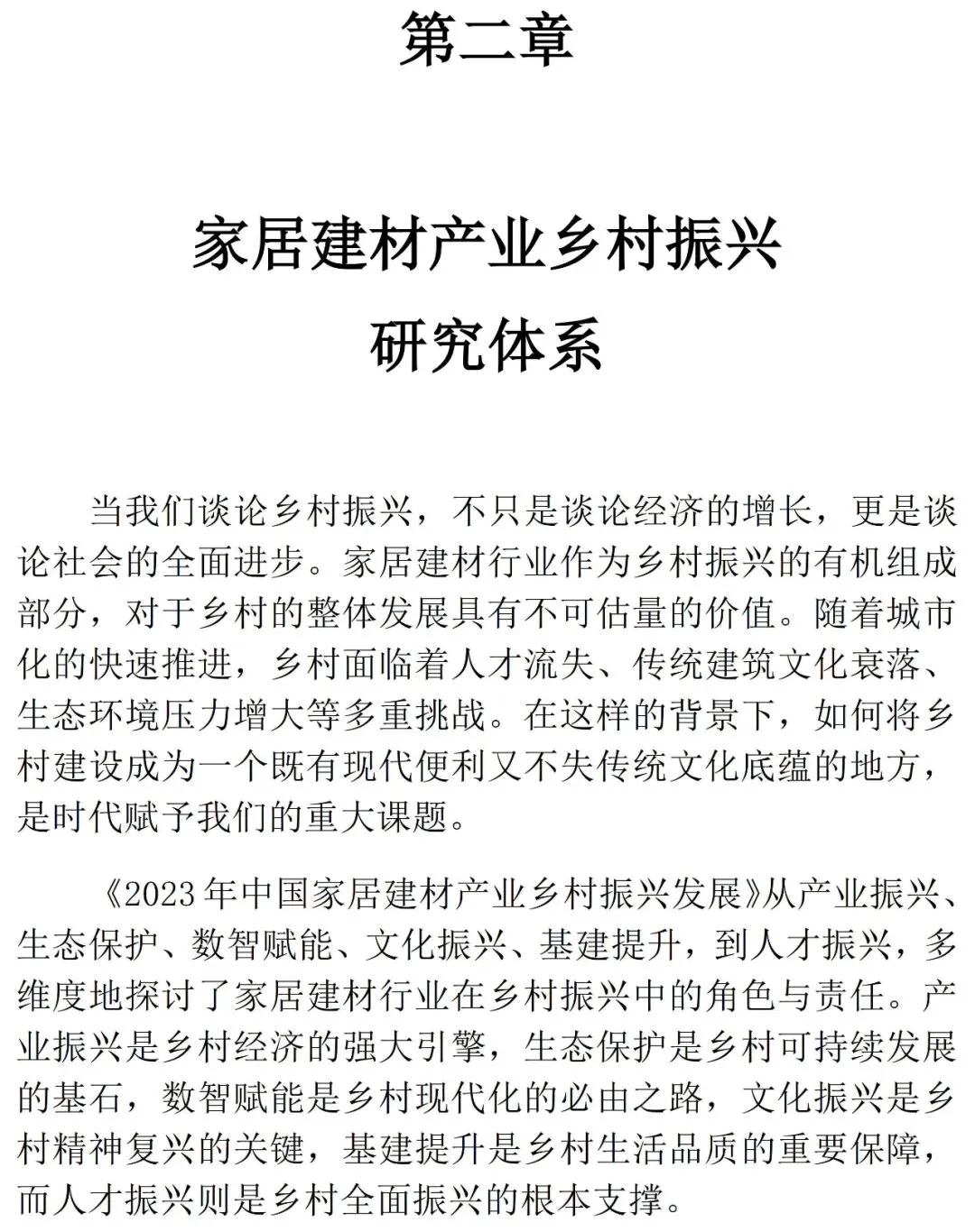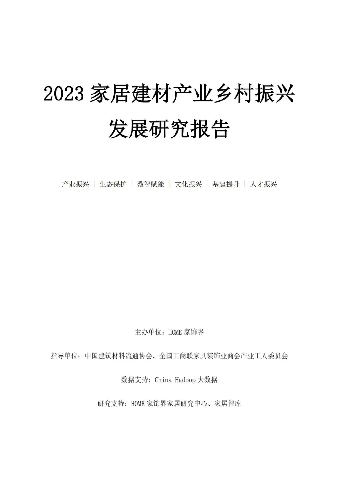为了深入了解家居建材行业在乡村振兴中的发展现状和趋势,HOME家饰界发布了《2023家居建材产业乡村振兴发展报告》,这也是HOME家饰界连续第三年发布家居建材产业乡村振兴发展报告。本届报告旨在对中国家居建材行业在乡村振兴中的贡献、作用和发展方向进行全面深入的研究和分析,详细介绍了中国家居建材行业在乡村振兴中的典型案例。通过对行业现状和未来趋势的剖析,报告将为相关决策部门、企业决策者和社会各界提供重要参考和政策建议。同时,我们也希望通过这份报告,能够激发更多家居建材企业关注乡村振兴,积极投身乡村建设,为推动城乡共同繁荣贡献力量,进一步推动中国乡村振兴事业的蓬勃发展。