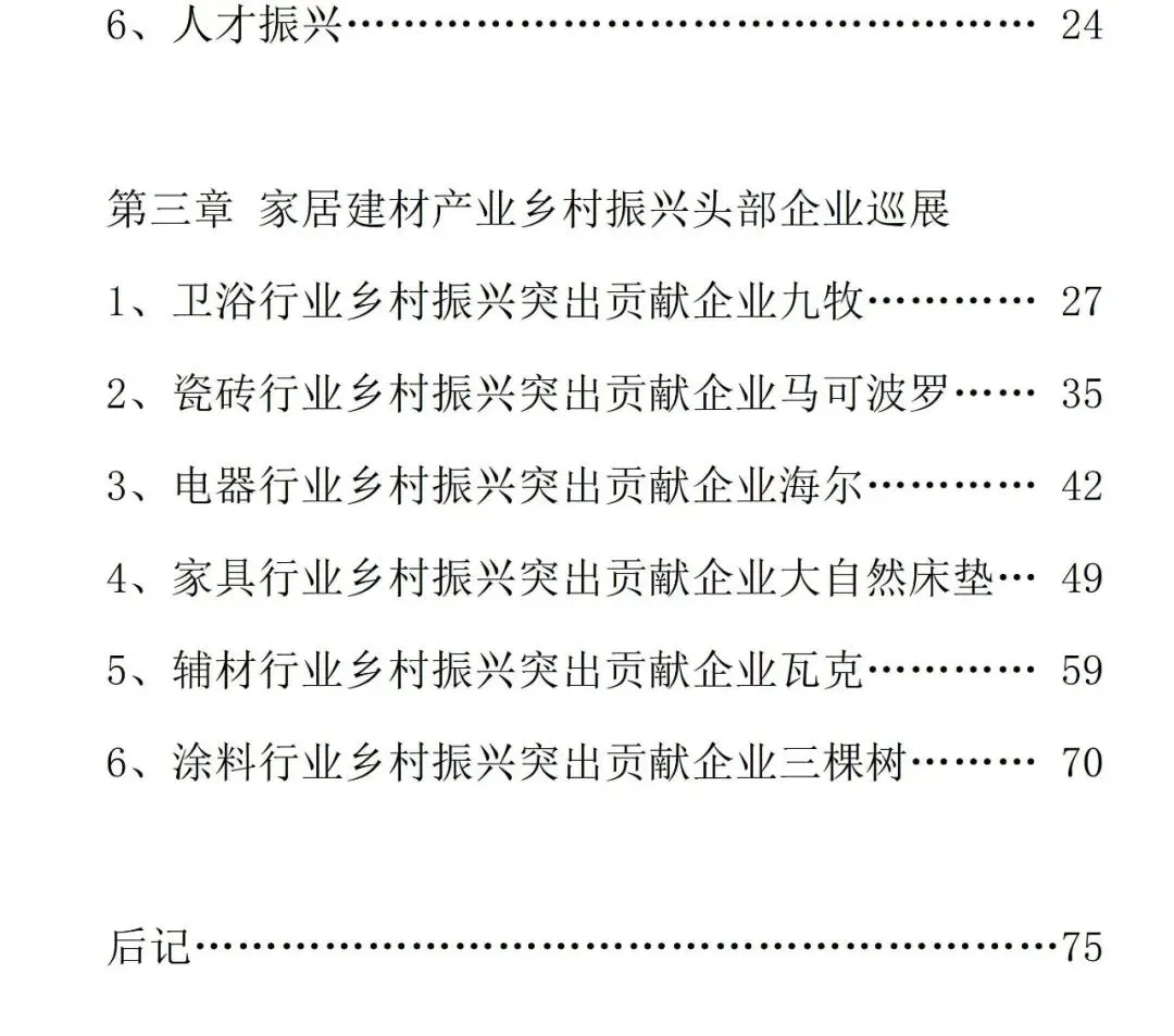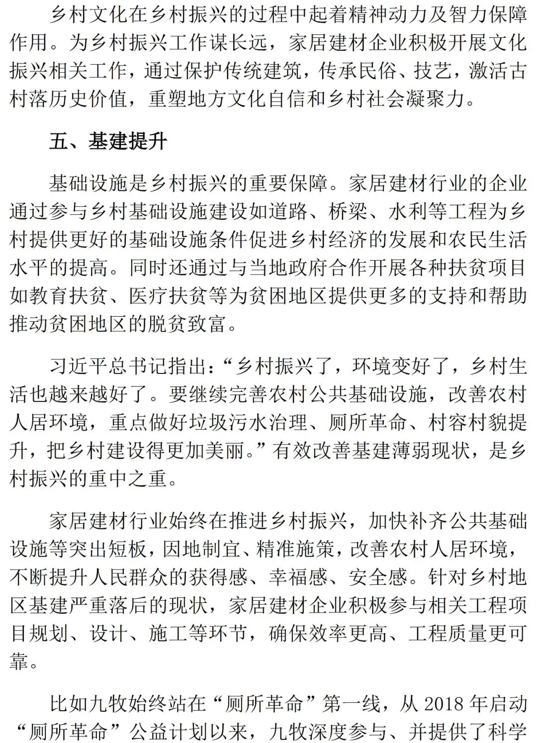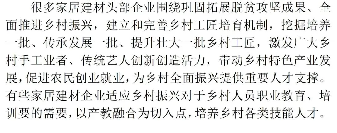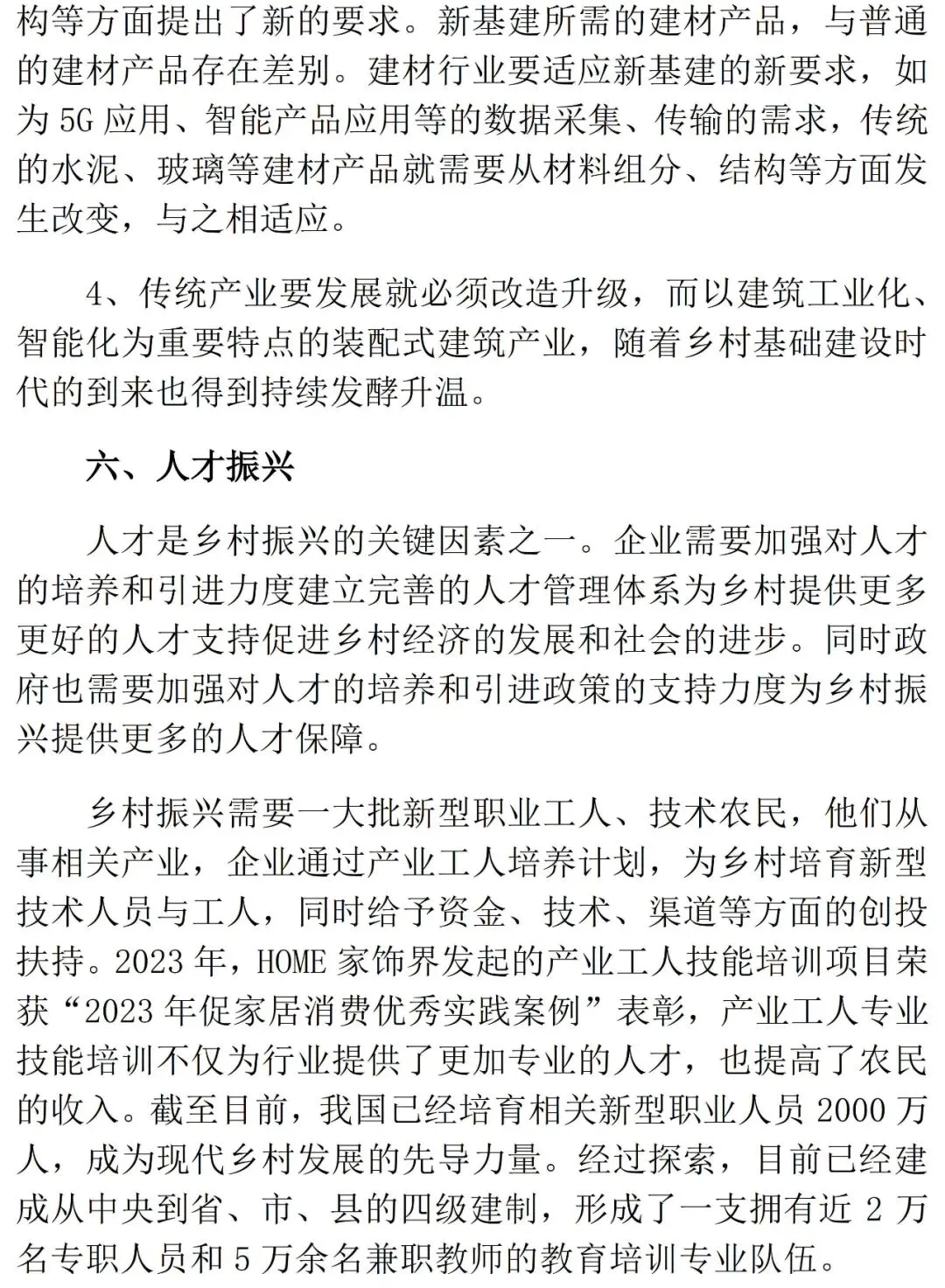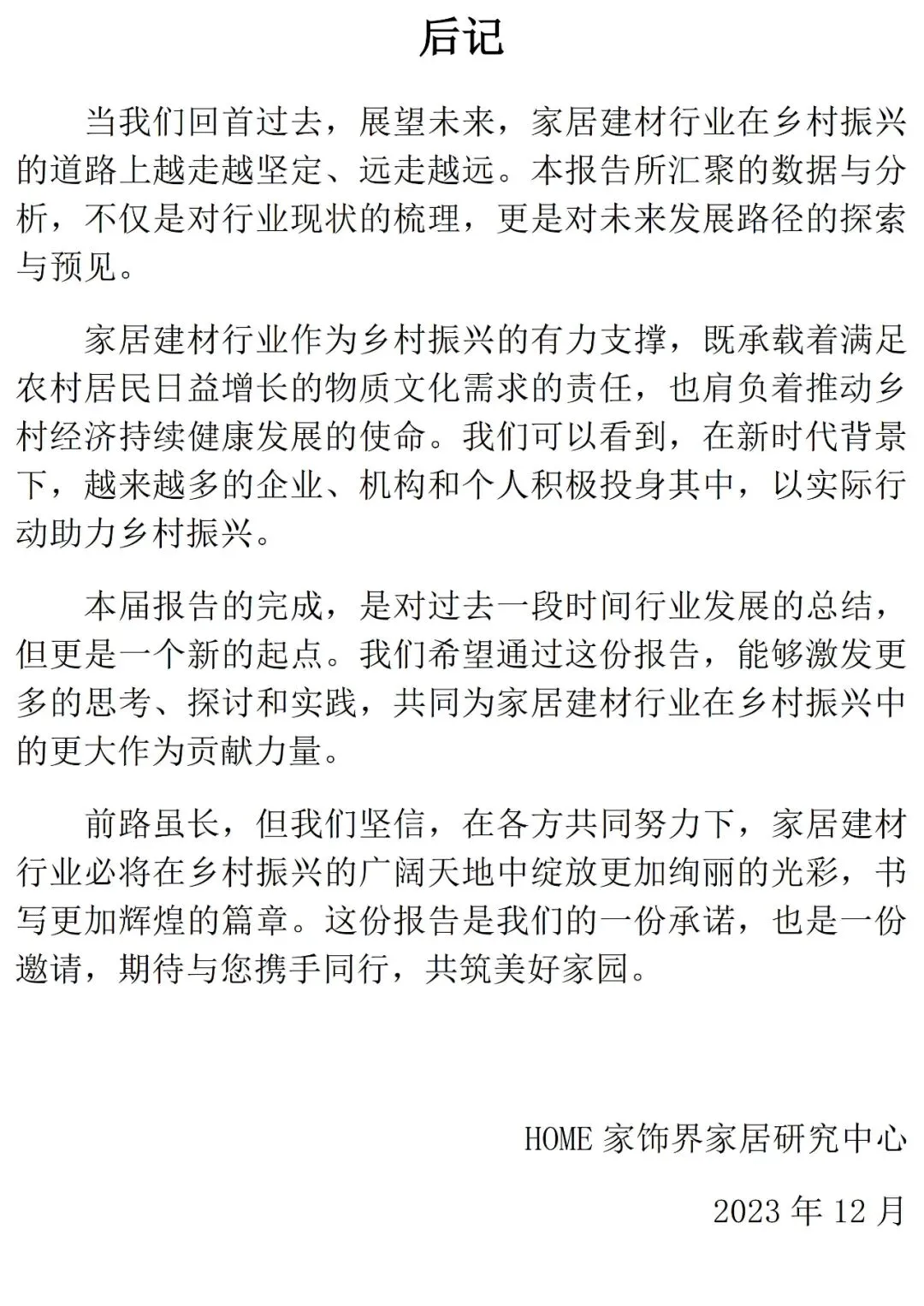 在本次报告中,HOME家饰界家居研究中心将详细介绍一些具体案例。希望通过全体家居建材同仁们的努力,能够让家居建材行业在乡村振兴中发挥更大的作用。