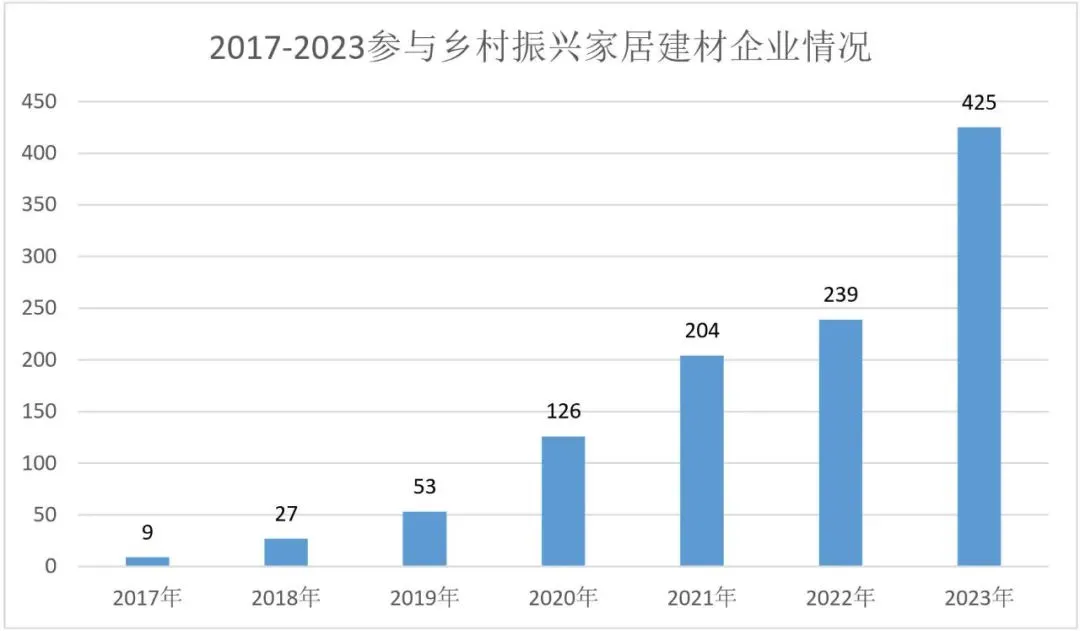据HOME家饰界家居研究中心统计,自2017年党的十九大报告首次提出乡村振兴战略以来,参与到乡村振兴中来的家居建材企业数量逐年增长,从2017年的9家企业增长到2023年425家企业。这些企业在乡村振兴和乡村建设中,不同程度的参与了产业振兴、生态保护、数智赋能、文化振兴、基建提升、 人才振兴等项目,其中包括农村人居环境整治、教育环境改善、人才培养、厕所革命、垃圾处理、太阳能、沼气、农作物秸秆资源综合利用等诸多方面。
