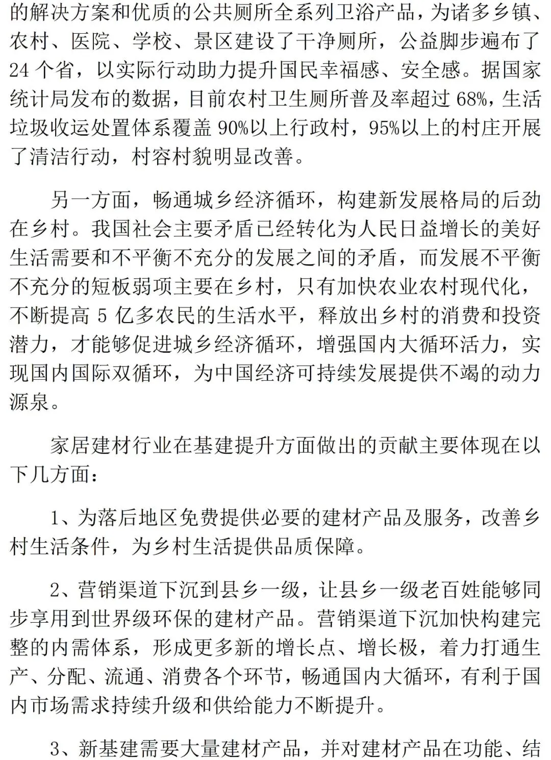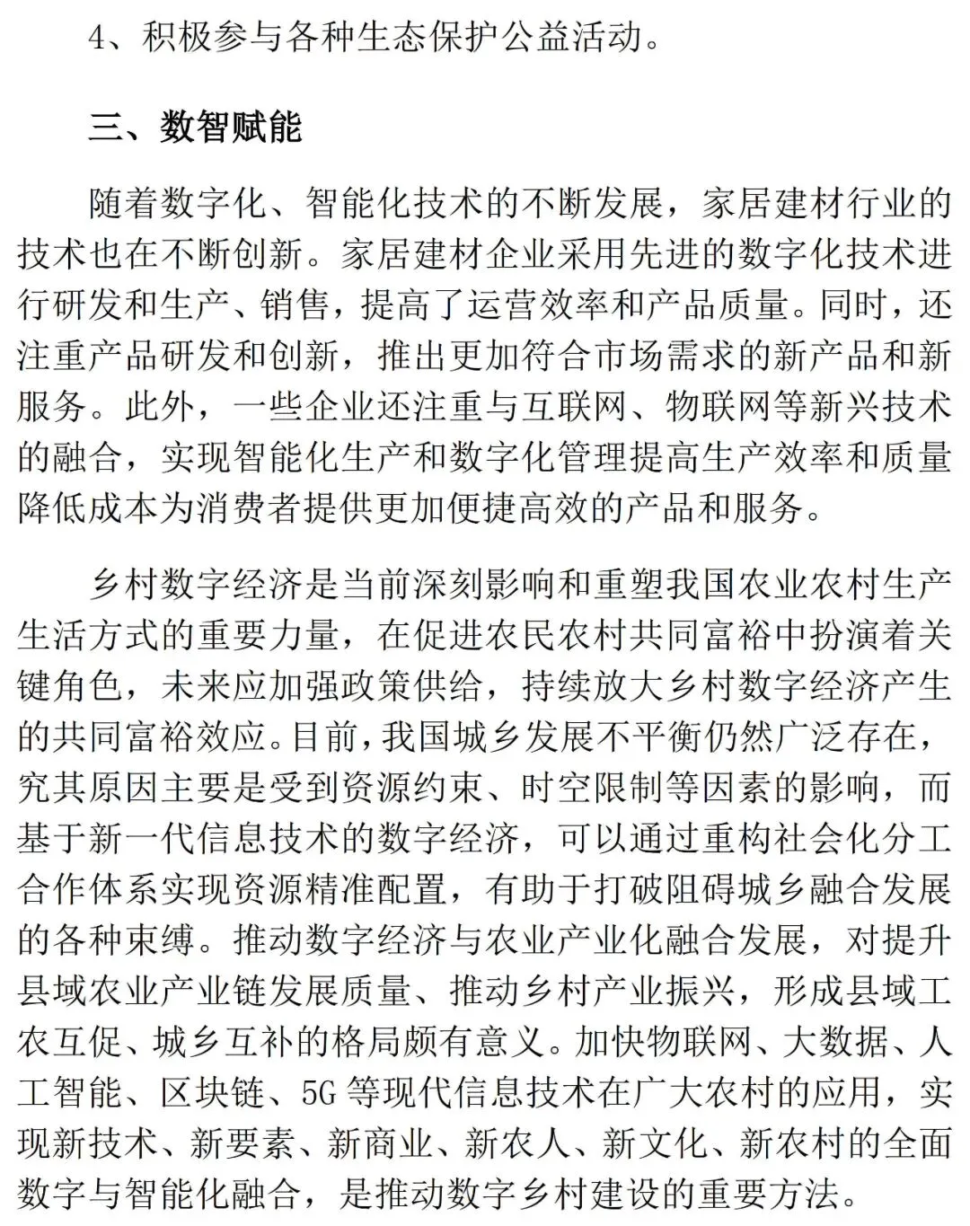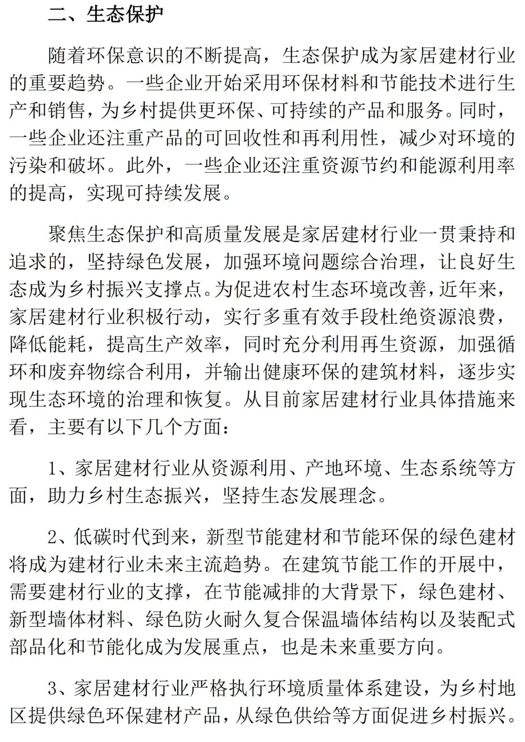 当前,我国农村地区的发展面临着众多机遇和挑战,与城市相比,农村地区的发展仍然存在较大的差距。家居建材行业作为直接服务于民生的行业,对于改善农村居住环境、提高农民生活质量具有不可替代的作用。在乡村振兴战略的推动下,家居建材行业的发展也取得了显著的成效。一方面,企业通过技术创新和转型升级,提高产品质量和竞争力;另一方面,通过拓展农村市场,推广绿色环保建材,优化农村居住环境,推动了农村经济的发展和民生改善。