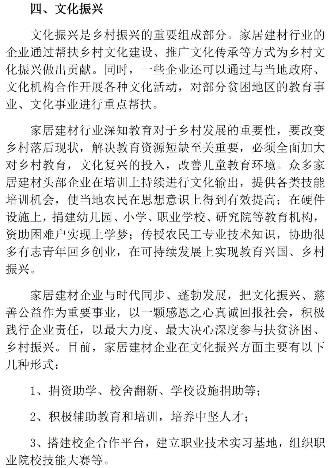 乡村振兴是我国四个现代化目标的重要组成部分,也是实现全面建成小康社会的关键一环。越来越多的人开始考虑如何改善农村生活条件,提高乡村经济发展水平。家居建材行业作为基础性产业,拥有广泛的市场需求和巨大的潜力,为乡村振兴提供了独特的机遇。随着城市化进程的加速,城市人口不断增加,家居建材行业为乡村地区提供更多的就业机会和经济增长点。同时,家居建材行业还将为乡村地区提供更好的生活条件和质量,使乡村地区的人们能够享受到更好的居住环境和居住条件。在这个背景下,作为支撑城乡建设的重要领域,家居建材行业积极发挥企业社会责任,踊跃成为乡村振兴的重要力量。