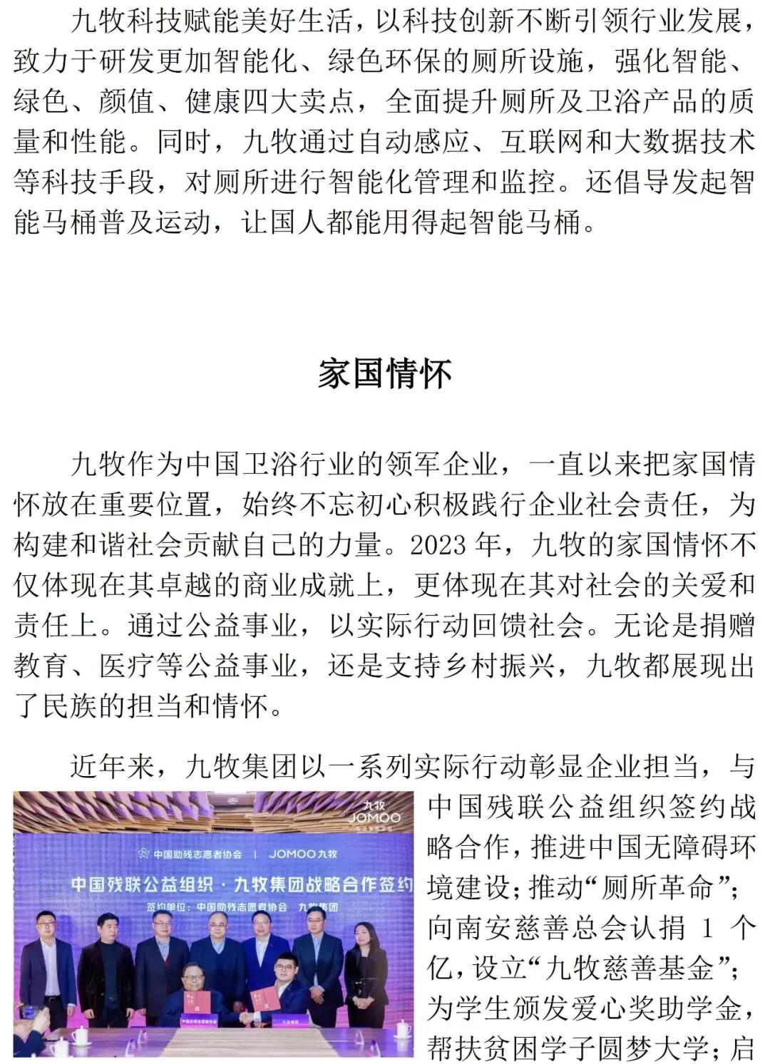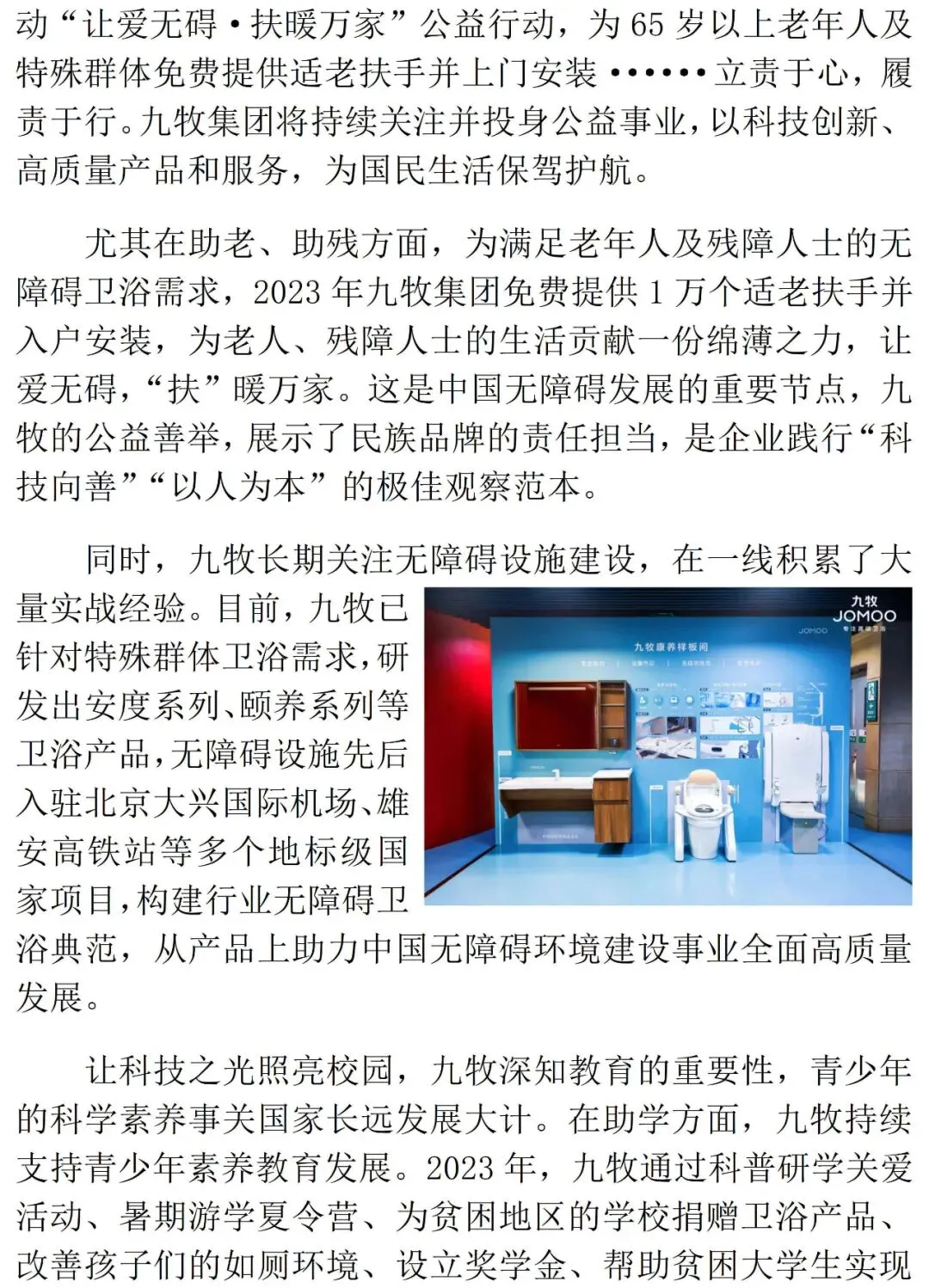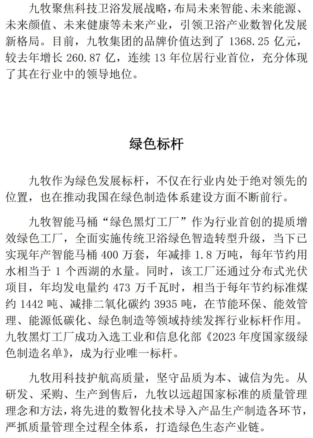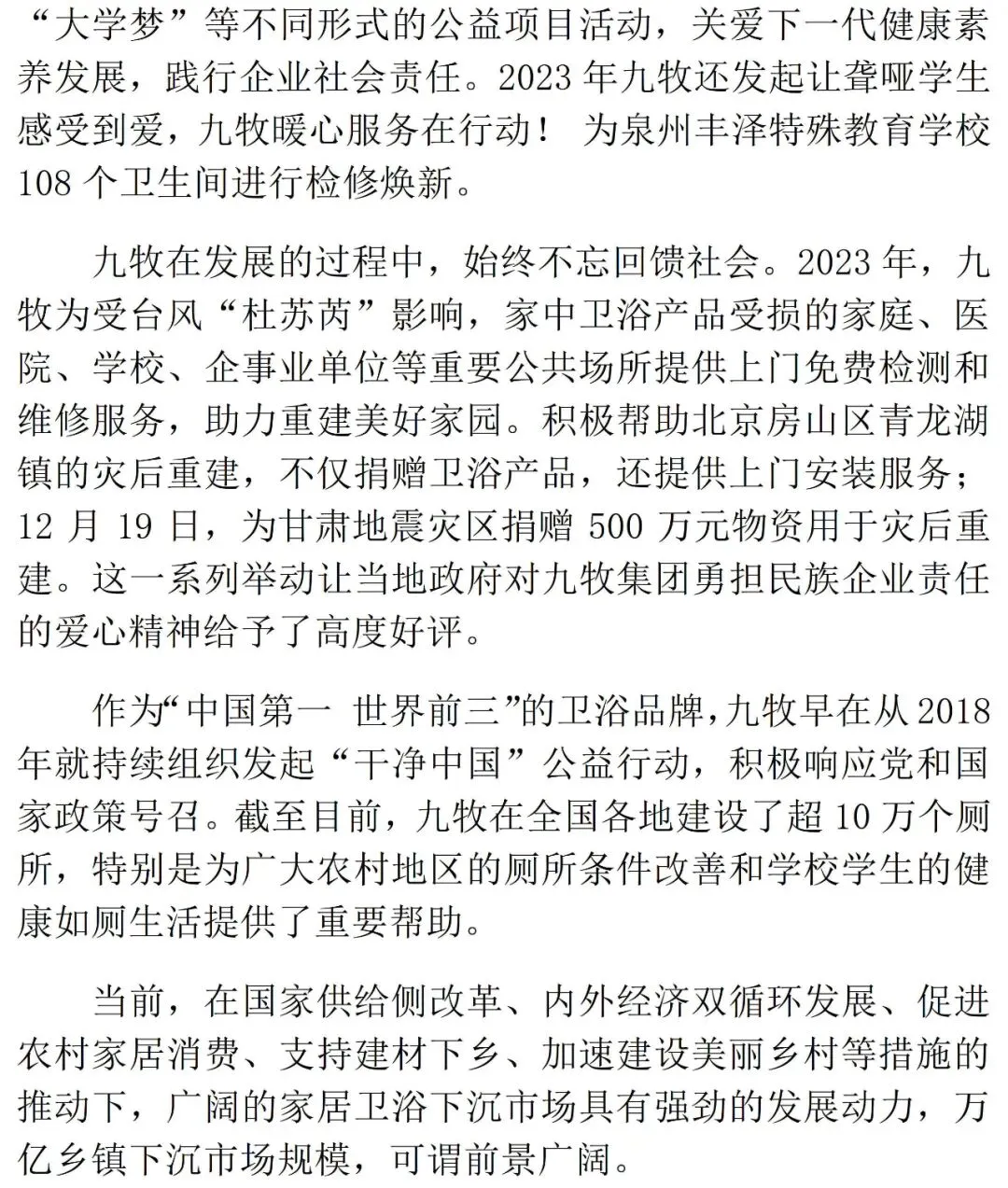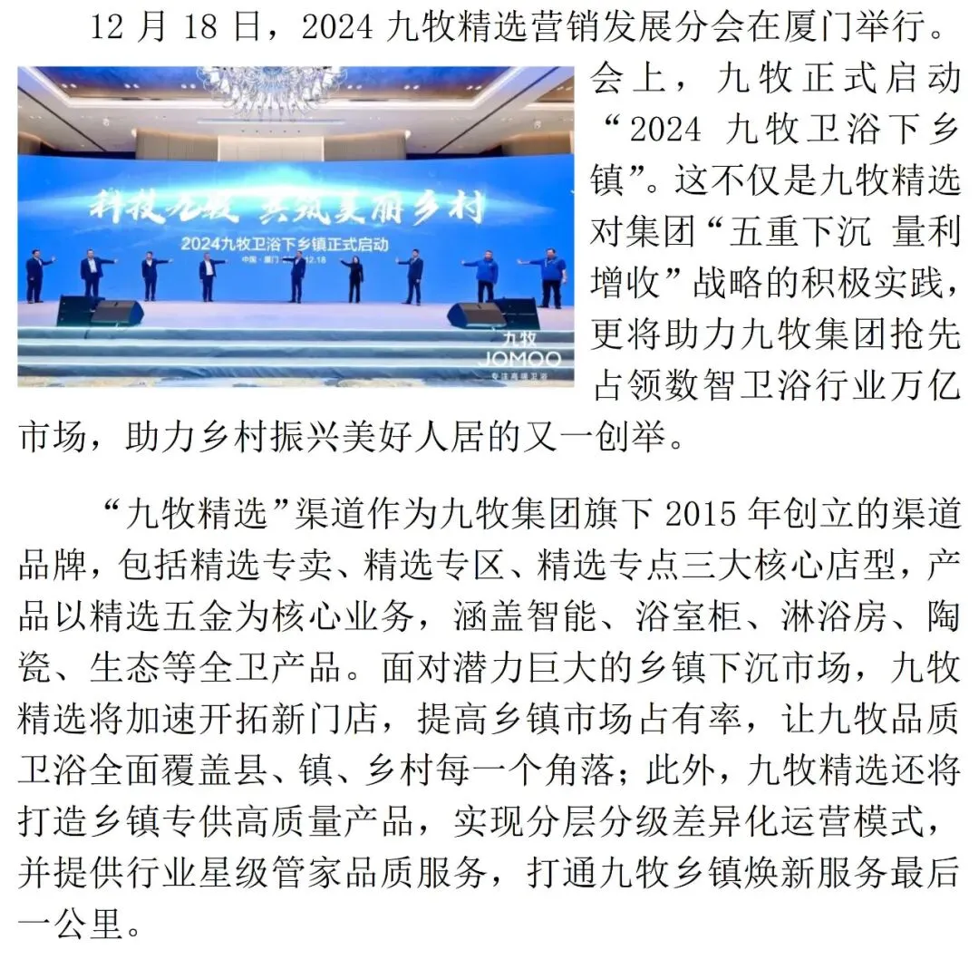 2023年12月,在2024九牧精选营销发展分会上,九牧正式启动“2024九牧卫浴下乡镇”。在国家供给侧改革、内外经济双循环发展、促进农村家居消费、支持建材下乡、加速建设美丽乡村等措施的推动下,广阔的家居卫浴下沉市场具有强劲的发展动力,万亿乡镇下沉市场规模,可谓前景广阔。“2024九牧卫浴下乡镇”将加速开拓新门店,提高乡镇市场占有率,让九牧品质卫浴全面覆盖县、镇、乡村每一个角落。同时,九牧精选还将打造乡镇专供高质量产品,实现分层分级差异化运营模式,并提供行业星级管家品质服务,打通九牧乡镇焕新服务最后一公里。