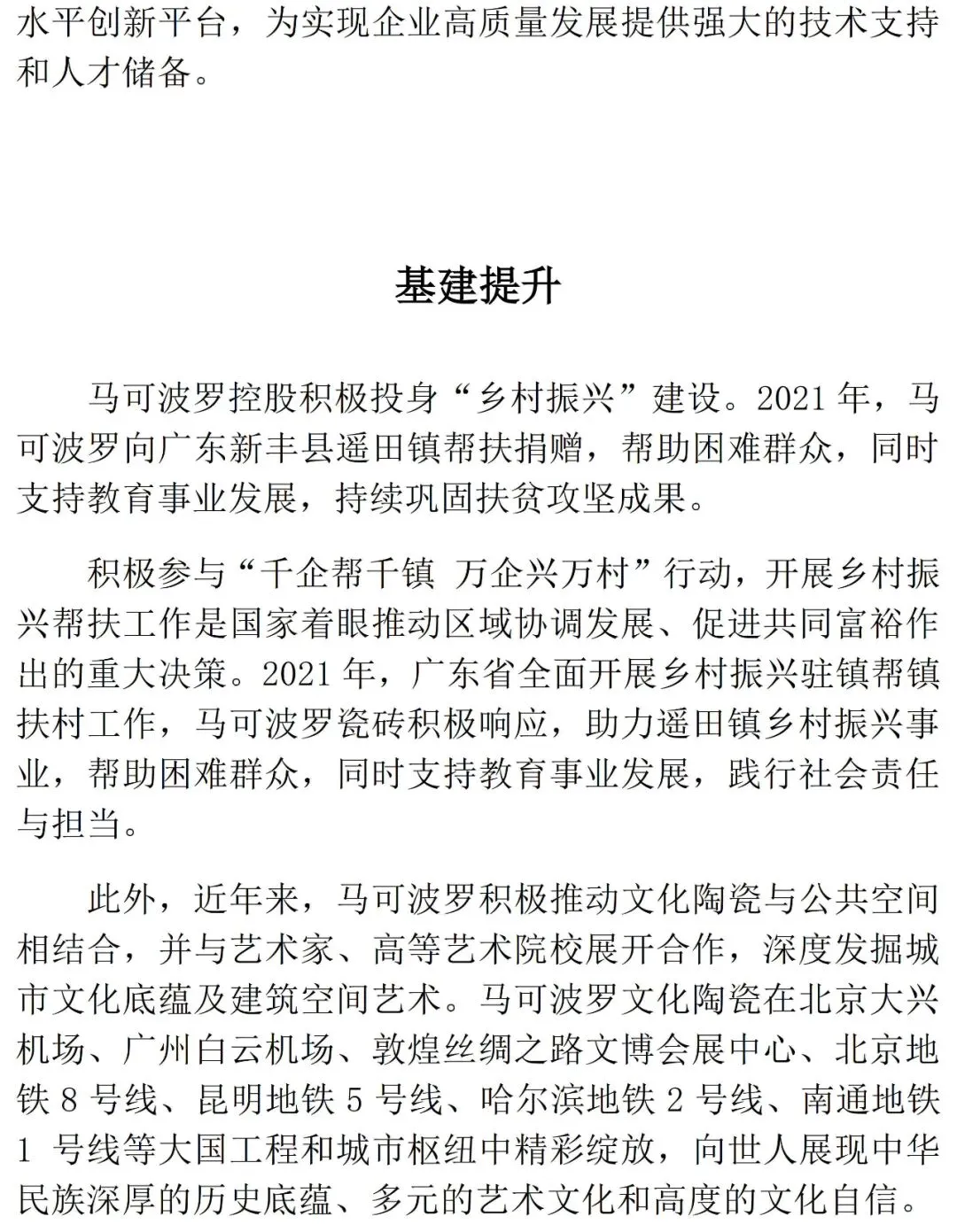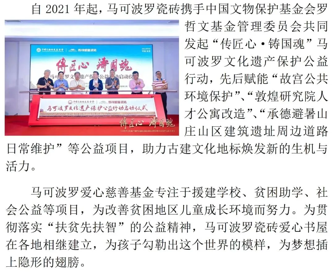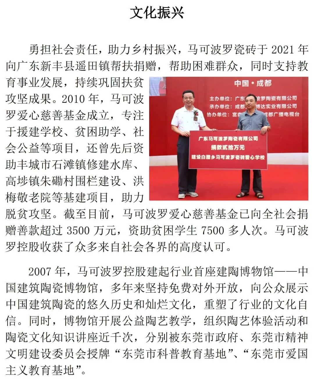 2023年8月,L&G捐赠百万陶瓷产品,为乡村振兴“添砖加瓦”。L&G向黔东南州黎平县捐赠的价值100万元的陶瓷产品,用于支持当地学校、医院等公共服务设施环境改善提升。L&G在助力乡村振兴发展的道路上,始终紧跟党和国家的步伐,持续关注并积极参与捐资助学、赈灾捐款、敬养老人、对口扶贫等一系列社会公益事业,以大爱精神及实际行动回馈社会。