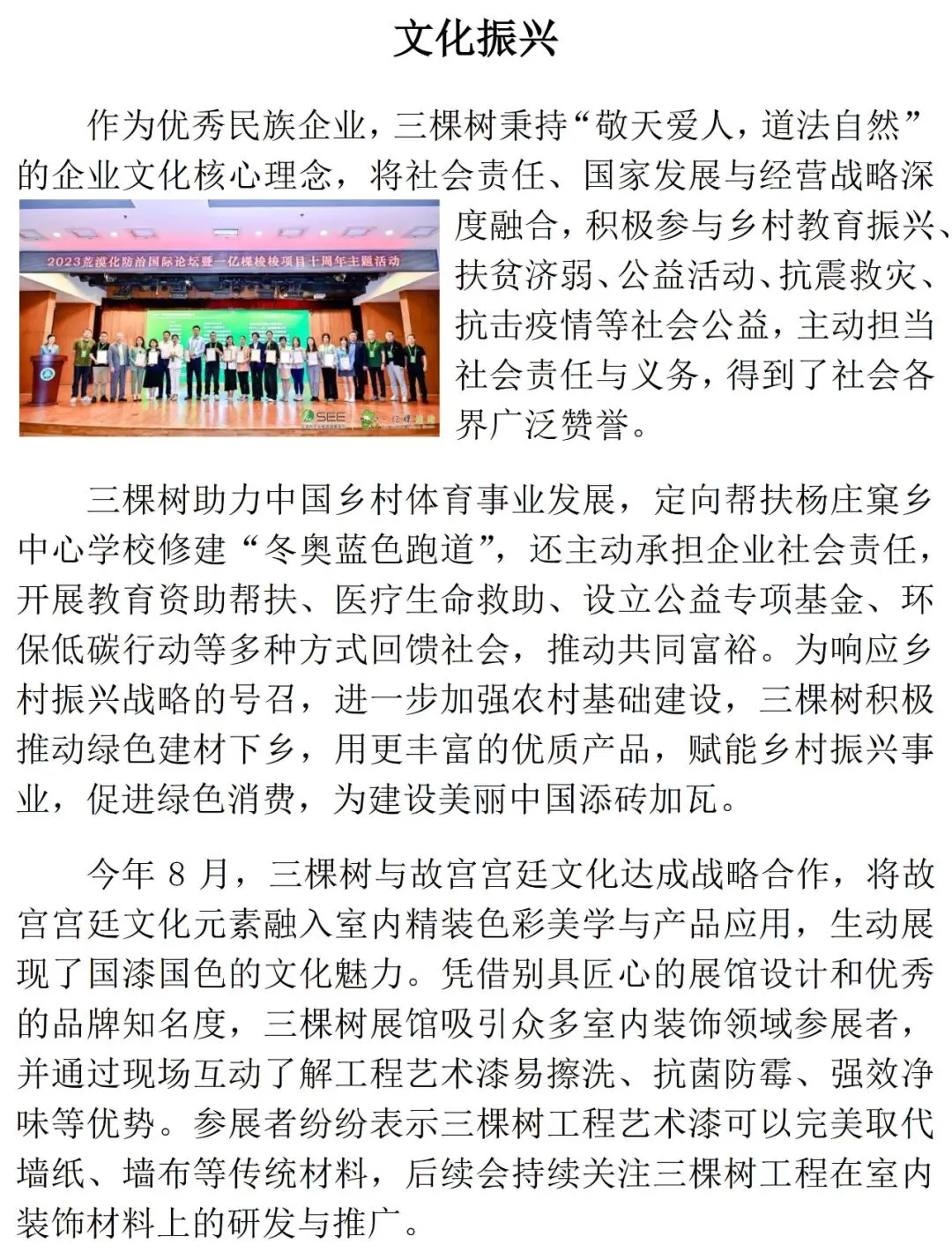2023年10月,北新建材响应国家乡村振兴战略,积极推进从工装到家装、从基材到面材、从产品到服务、从城市到县乡的“四个转变”创新服务模式,把重大工程同品质的产品带到村民家门口,服务人民美好生活。北新建材用文化走进乡村,响应乡村振兴战略,以建材力量助力美丽乡村建设。