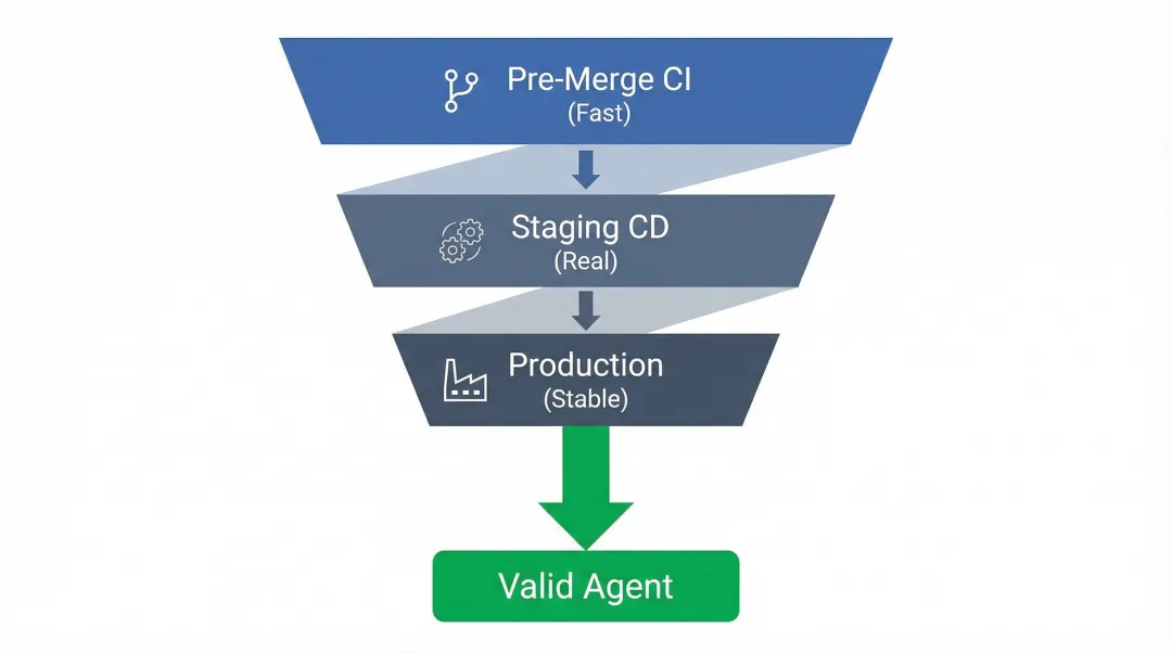 典型的 Agent CI/CD 流水线可以被设计成一个三阶段的漏斗模型,每一阶段都有明确的目标和关键任务: