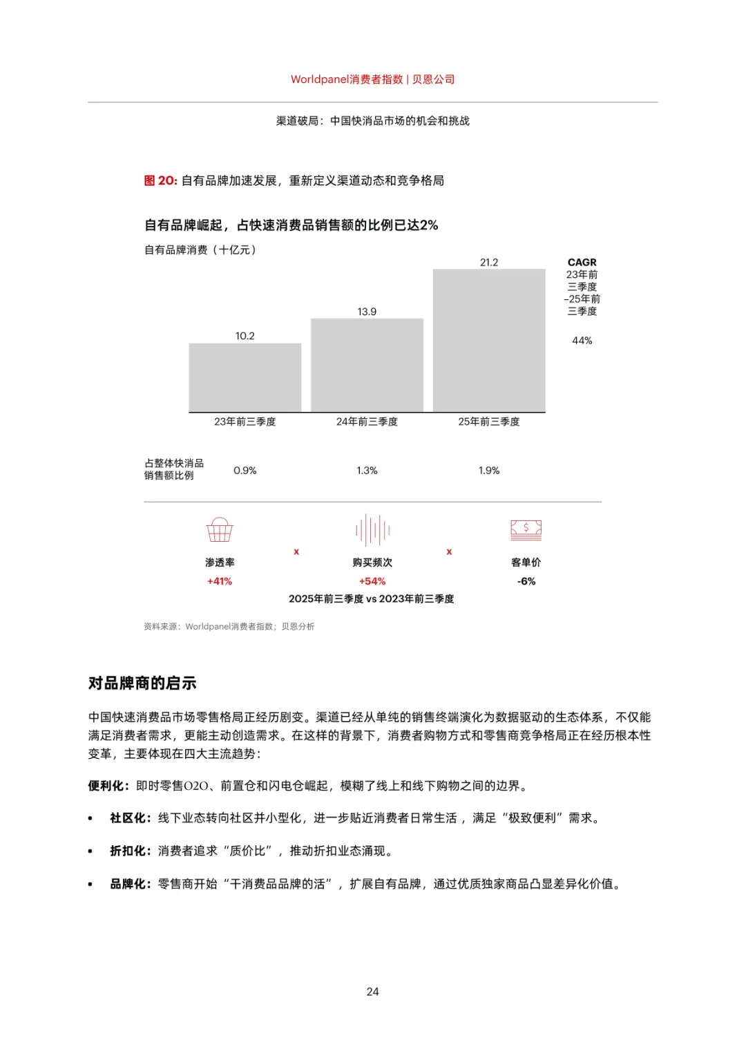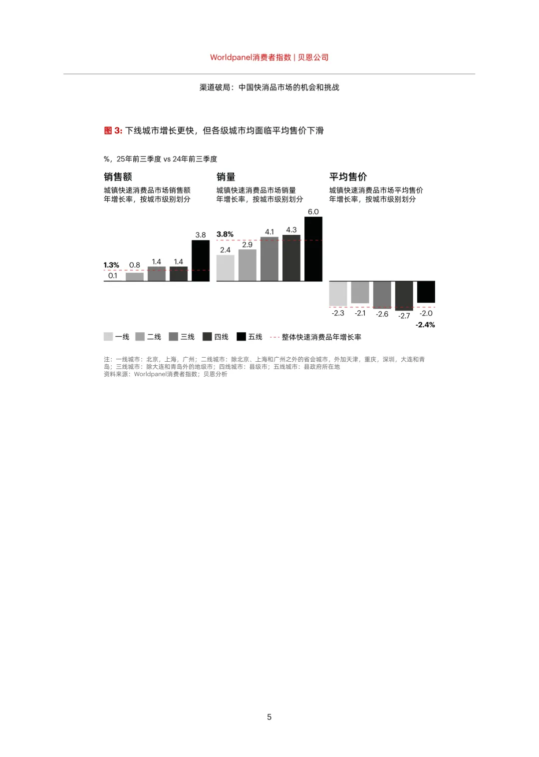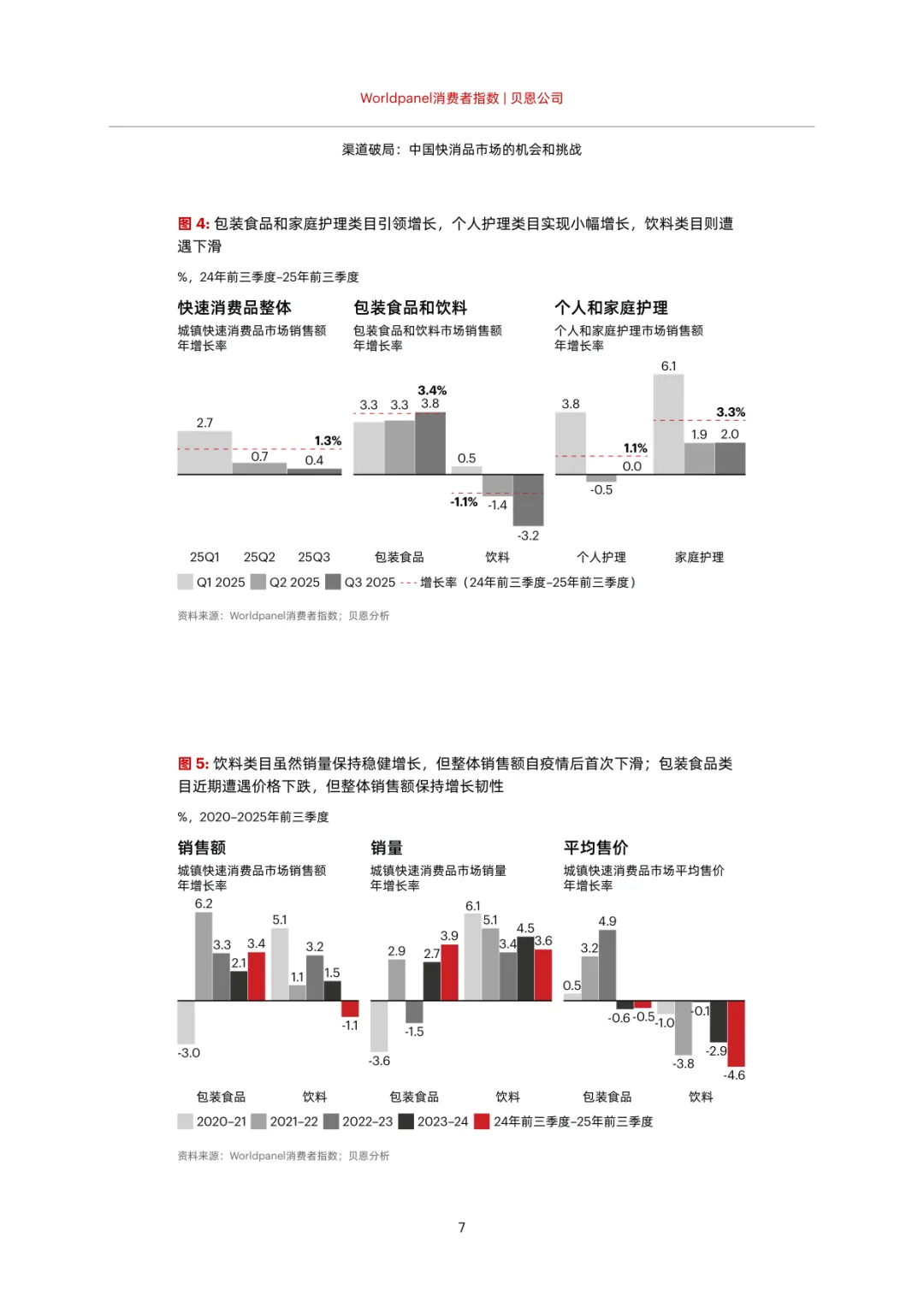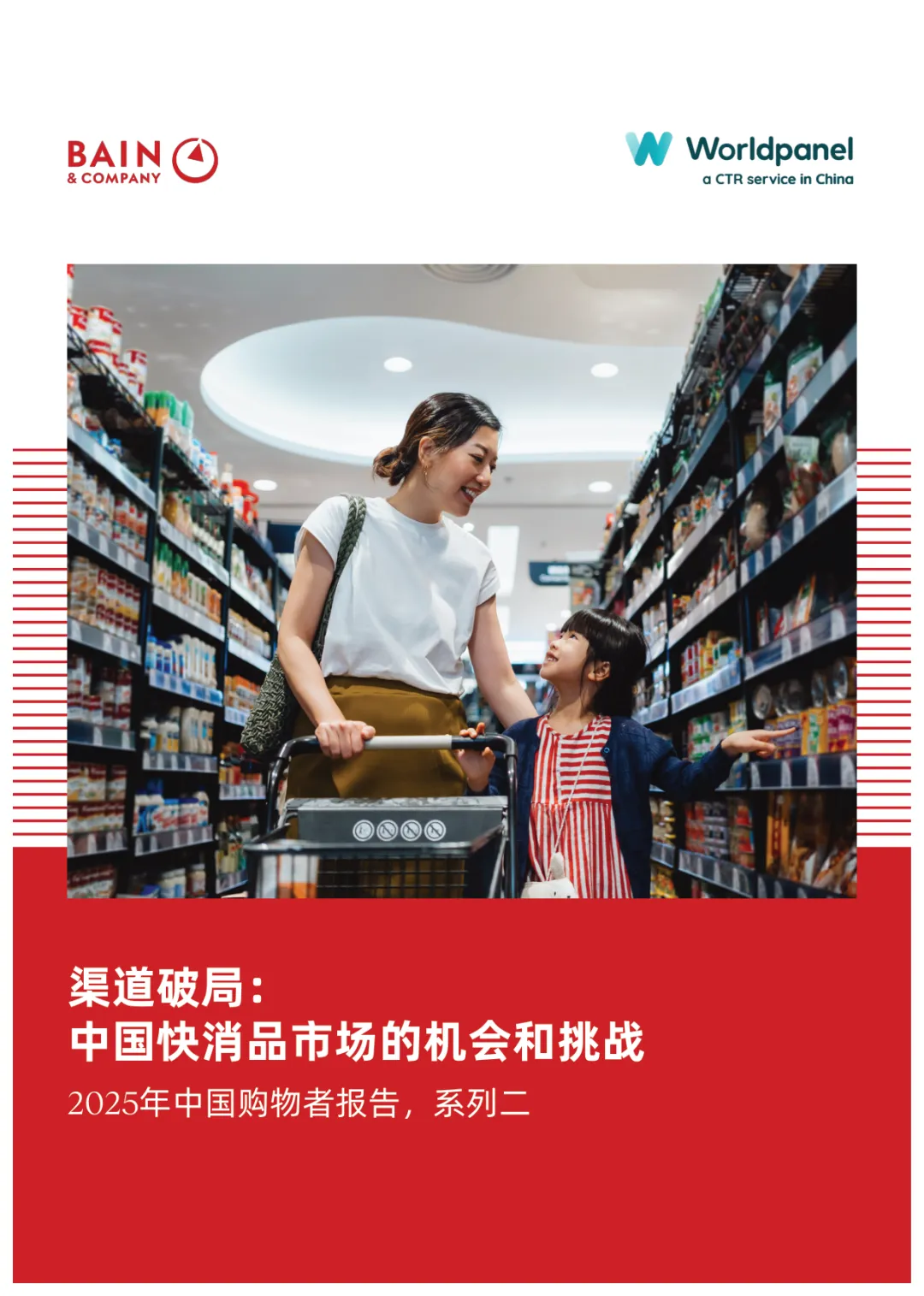 导读:2025 年前三季度,中国快消品市场企稳回升,销售额同比增长 1.3%,销量增长 3.8%,平均售价下降 2.4%,“消费平替” 趋势有所趋缓。下线城市贡献 80% 的市场增长,成为核心引擎,一、二线城市受宏观经济与消费趋势影响表现平淡。品类方面,包装食品、家庭护理类目分别增长 3.4% 和 3.3%,个人护理类目止跌回升,饮料类目同比下降 1.1%。渠道格局迎来结构性变革,仓储会员店、零食集合店、折扣店等新兴线下业态逆势扩张,增速分别达 40%、51% 和 92%。电商渠道增长 7%,抖音与拼多多成为核心增长动力,即时零售 O2O 渠道强势复苏。市场呈现便利化、社区化、折扣化、品牌化趋势,自有品牌加速发展。品牌商需聚焦需求体系、产品组合、渠道通路与落地执行,适配不同渠道特性与消费需求,通过精准洞察与创新实现可持续增长。