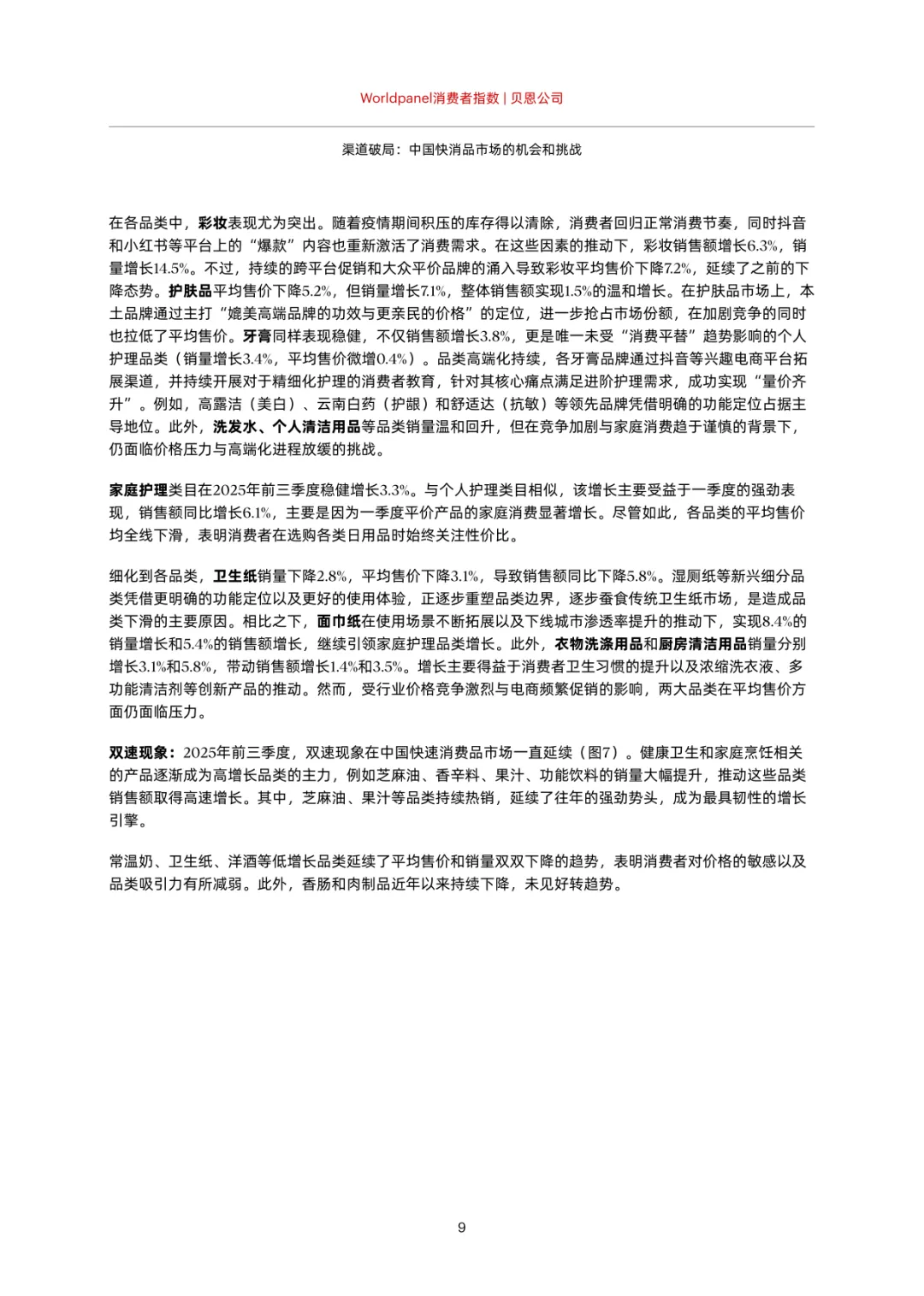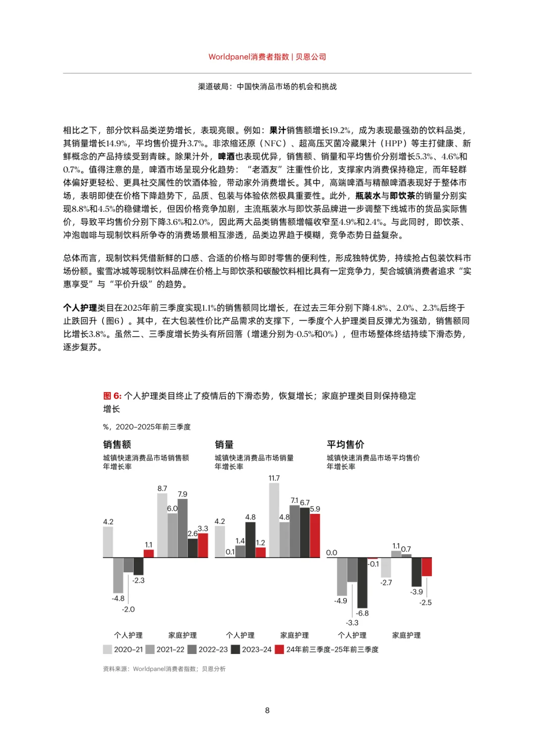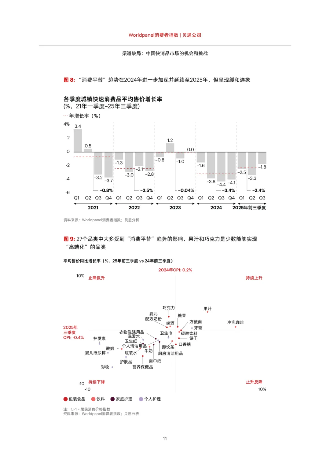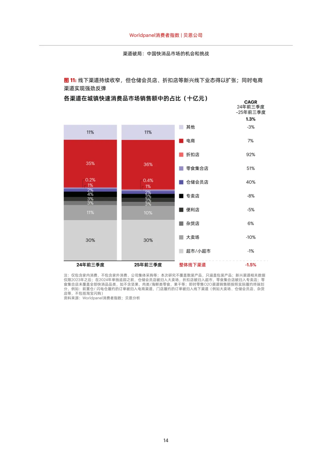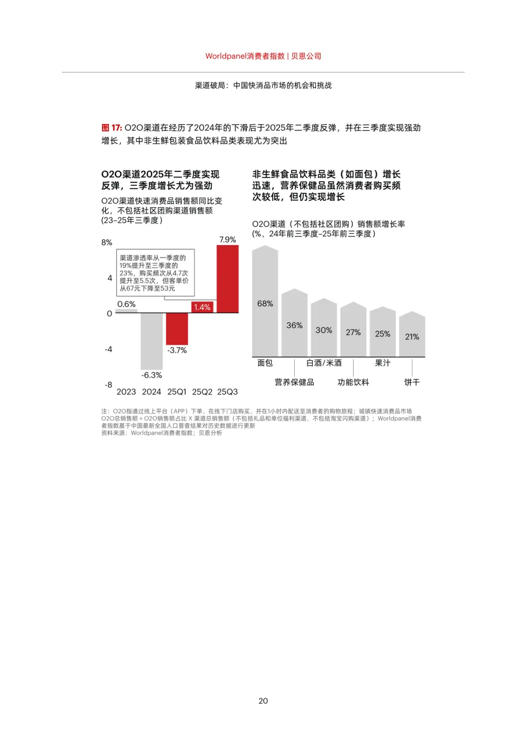 导读:2025 年前三季度,中国快消品市场企稳回升,销售额同比增长 1.3%,销量增长 3.8%,平均售价下降 2.4%,“消费平替” 趋势有所趋缓。下线城市贡献 80% 的市场增长,成为核心引擎,一、二线城市受宏观经济与消费趋势影响表现平淡。品类方面,包装食品、家庭护理类目分别增长 3.4% 和 3.3%,个人护理类目止跌回升,饮料类目同比下降 1.1%。渠道格局迎来结构性变革,仓储会员店、零食集合店、折扣店等新兴线下业态逆势扩张,增速分别达 40%、51% 和 92%。电商渠道增长 7%,抖音与拼多多成为核心增长动力,即时零售 O2O 渠道强势复苏。市场呈现便利化、社区化、折扣化、品牌化趋势,自有品牌加速发展。品牌商需聚焦需求体系、产品组合、渠道通路与落地执行,适配不同渠道特性与消费需求,通过精准洞察与创新实现可持续增长。