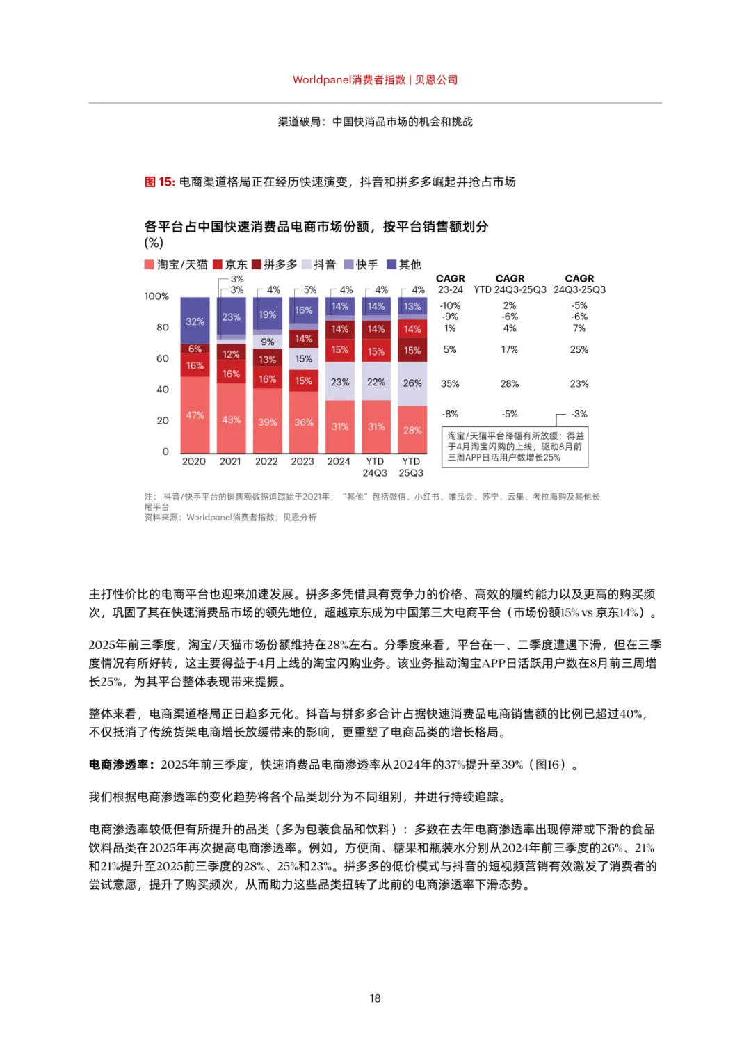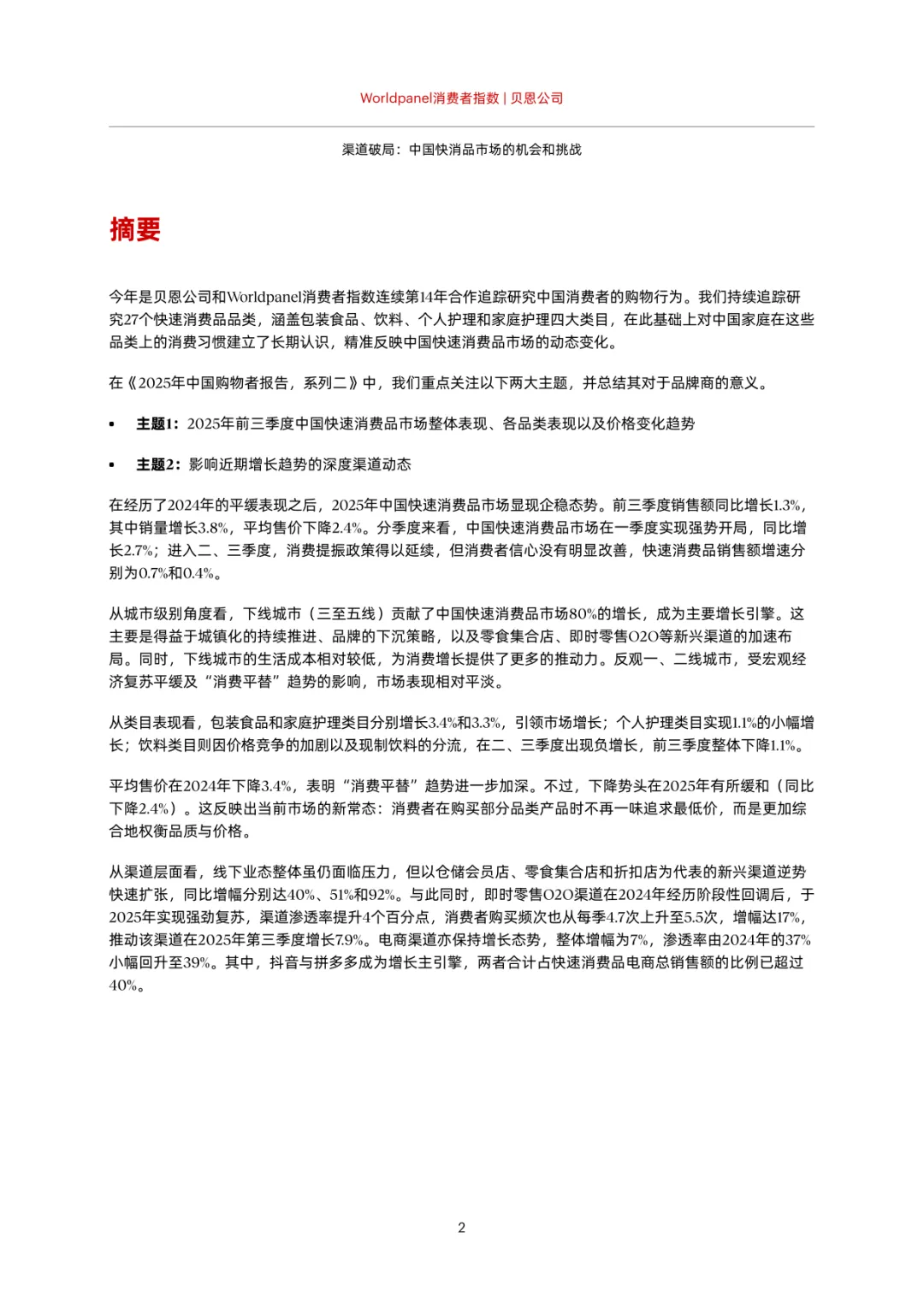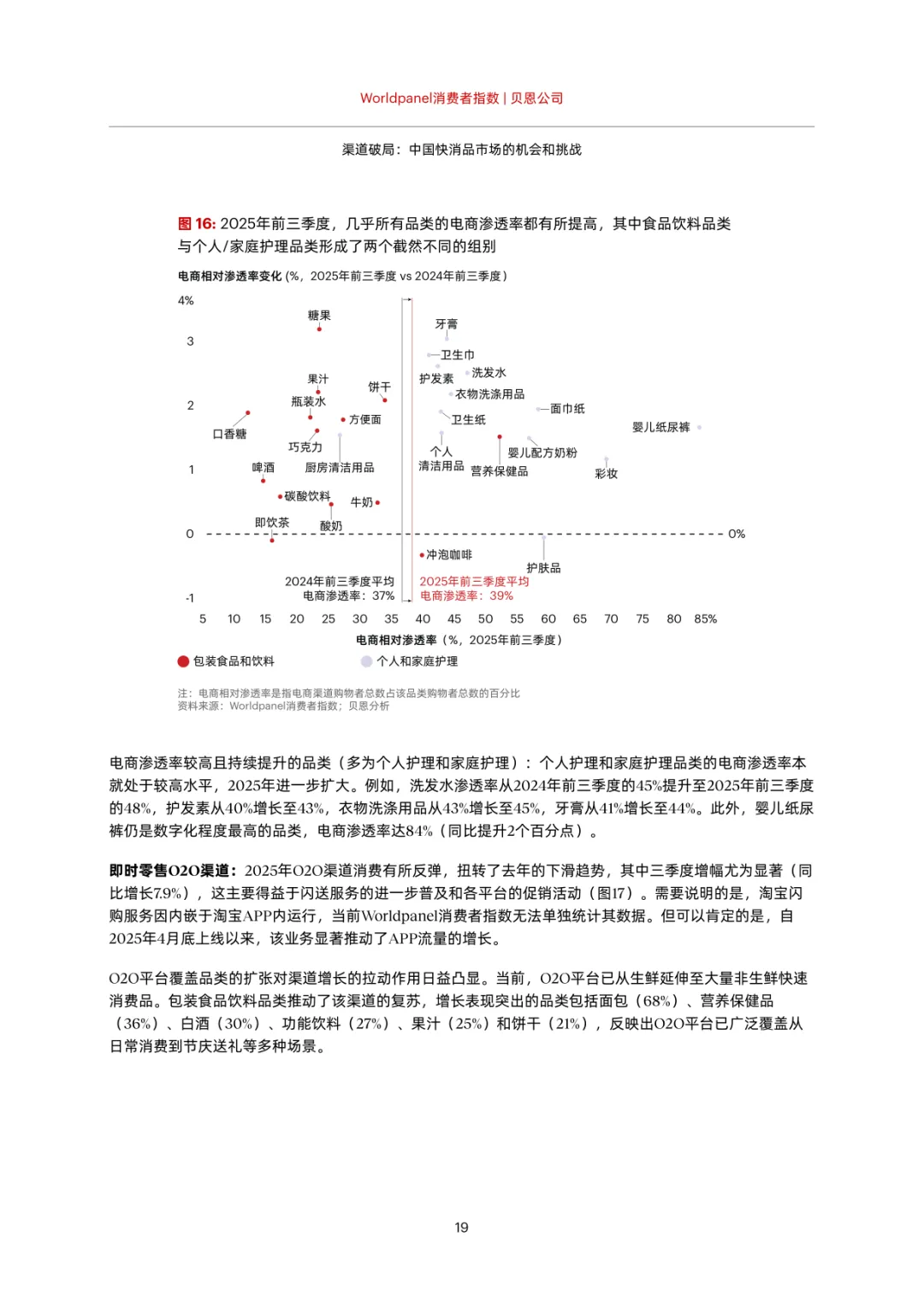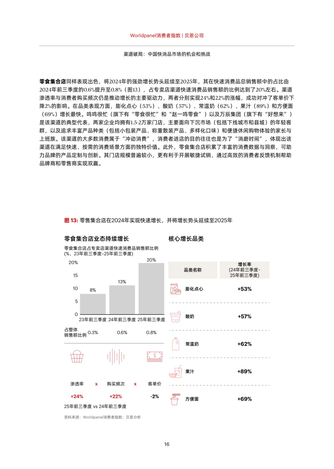 导读:2025 年前三季度,中国快消品市场企稳回升,销售额同比增长 1.3%,销量增长 3.8%,平均售价下降 2.4%,“消费平替” 趋势有所趋缓。下线城市贡献 80% 的市场增长,成为核心引擎,一、二线城市受宏观经济与消费趋势影响表现平淡。品类方面,包装食品、家庭护理类目分别增长 3.4% 和 3.3%,个人护理类目止跌回升,饮料类目同比下降 1.1%。渠道格局迎来结构性变革,仓储会员店、零食集合店、折扣店等新兴线下业态逆势扩张,增速分别达 40%、51% 和 92%。电商渠道增长 7%,抖音与拼多多成为核心增长动力,即时零售 O2O 渠道强势复苏。市场呈现便利化、社区化、折扣化、品牌化趋势,自有品牌加速发展。品牌商需聚焦需求体系、产品组合、渠道通路与落地执行,适配不同渠道特性与消费需求,通过精准洞察与创新实现可持续增长。