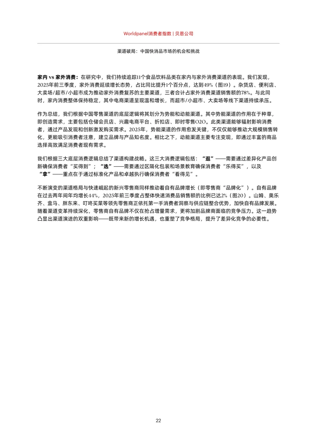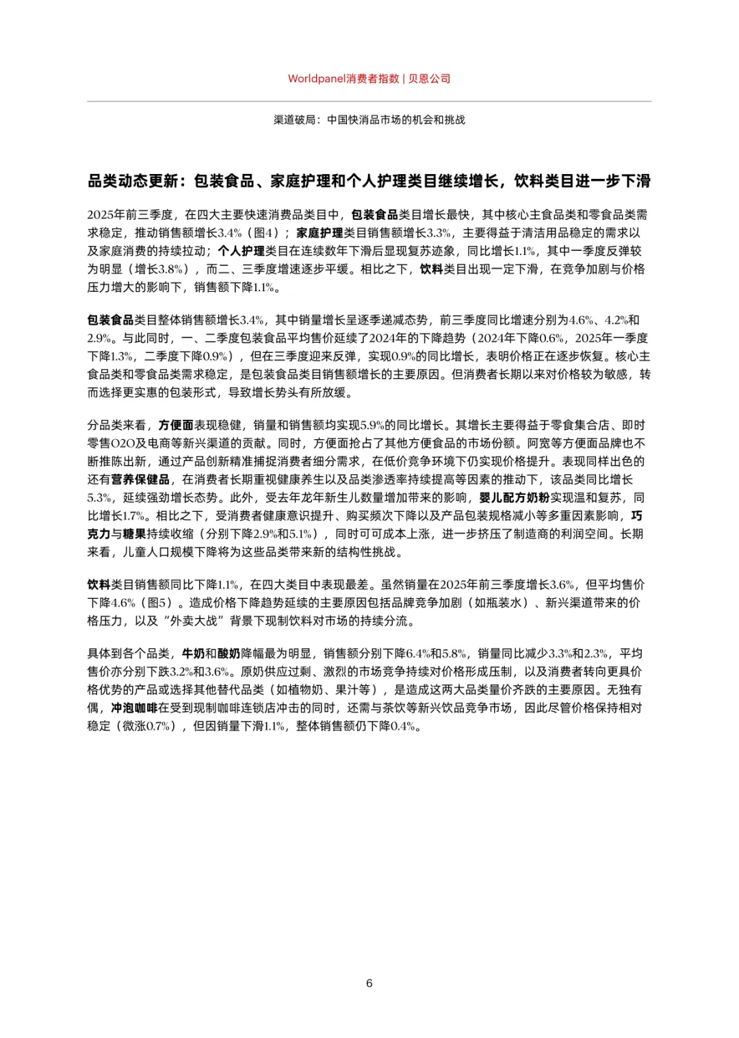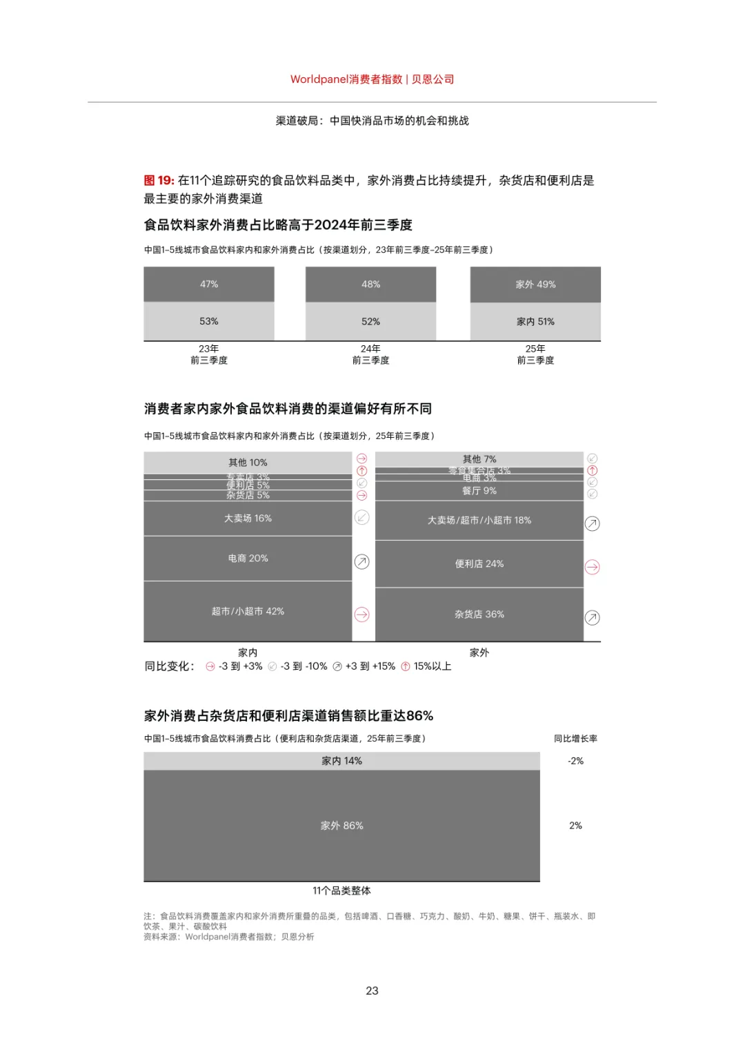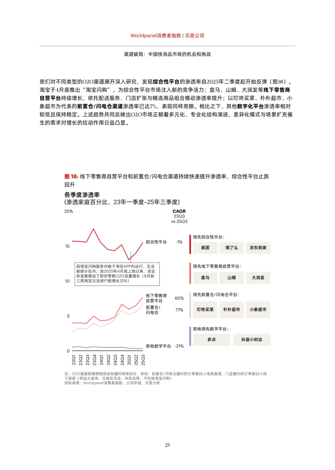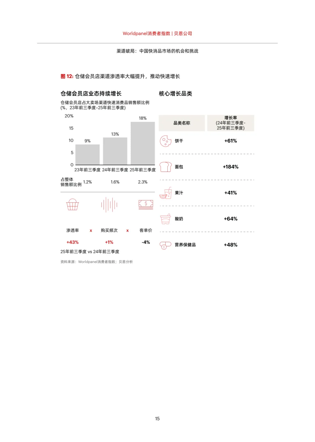 导读:2025 年前三季度,中国快消品市场企稳回升,销售额同比增长 1.3%,销量增长 3.8%,平均售价下降 2.4%,“消费平替” 趋势有所趋缓。下线城市贡献 80% 的市场增长,成为核心引擎,一、二线城市受宏观经济与消费趋势影响表现平淡。品类方面,包装食品、家庭护理类目分别增长 3.4% 和 3.3%,个人护理类目止跌回升,饮料类目同比下降 1.1%。渠道格局迎来结构性变革,仓储会员店、零食集合店、折扣店等新兴线下业态逆势扩张,增速分别达 40%、51% 和 92%。电商渠道增长 7%,抖音与拼多多成为核心增长动力,即时零售 O2O 渠道强势复苏。市场呈现便利化、社区化、折扣化、品牌化趋势,自有品牌加速发展。品牌商需聚焦需求体系、产品组合、渠道通路与落地执行,适配不同渠道特性与消费需求,通过精准洞察与创新实现可持续增长。