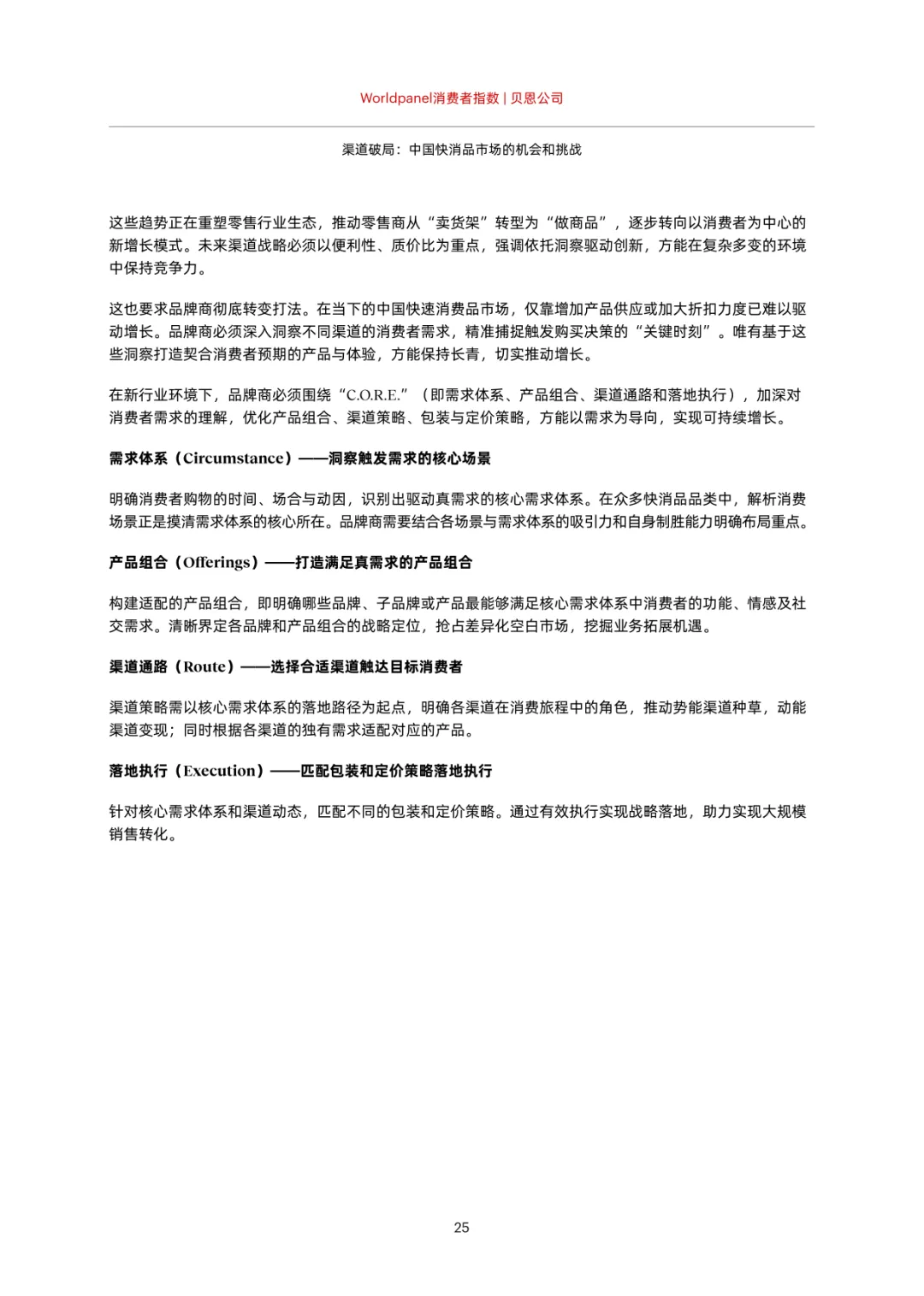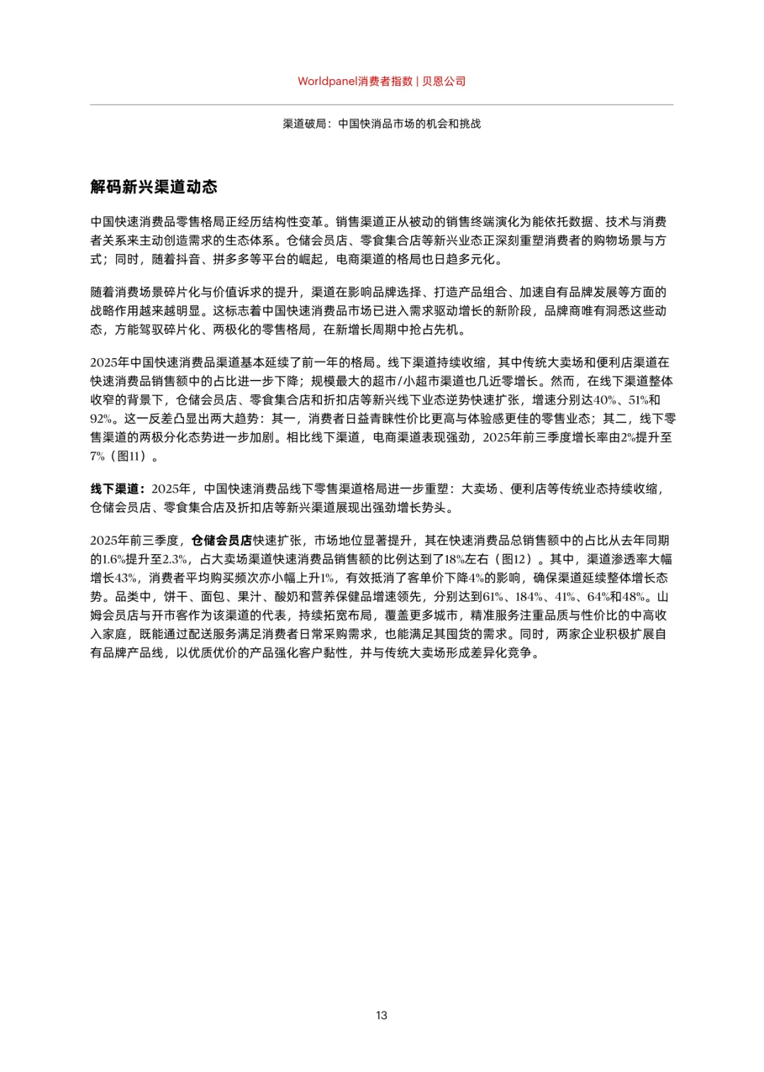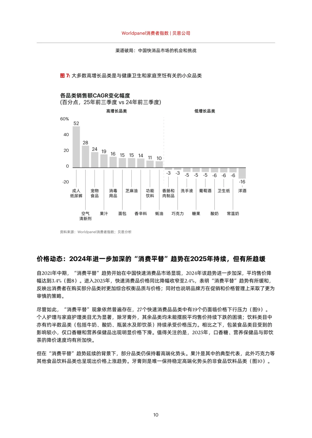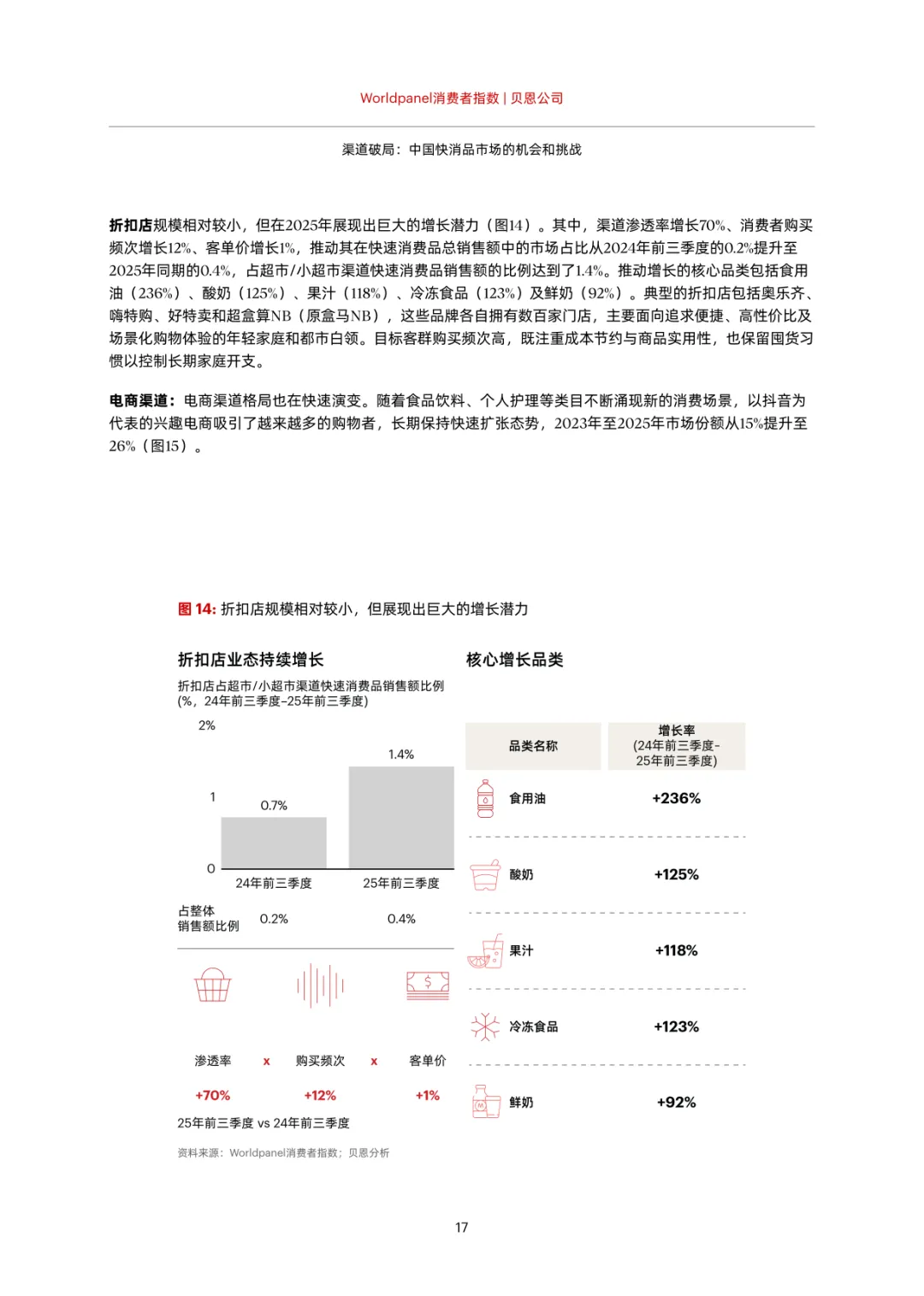 导读:2025 年前三季度,中国快消品市场企稳回升,销售额同比增长 1.3%,销量增长 3.8%,平均售价下降 2.4%,“消费平替” 趋势有所趋缓。下线城市贡献 80% 的市场增长,成为核心引擎,一、二线城市受宏观经济与消费趋势影响表现平淡。品类方面,包装食品、家庭护理类目分别增长 3.4% 和 3.3%,个人护理类目止跌回升,饮料类目同比下降 1.1%。渠道格局迎来结构性变革,仓储会员店、零食集合店、折扣店等新兴线下业态逆势扩张,增速分别达 40%、51% 和 92%。电商渠道增长 7%,抖音与拼多多成为核心增长动力,即时零售 O2O 渠道强势复苏。市场呈现便利化、社区化、折扣化、品牌化趋势,自有品牌加速发展。品牌商需聚焦需求体系、产品组合、渠道通路与落地执行,适配不同渠道特性与消费需求,通过精准洞察与创新实现可持续增长。