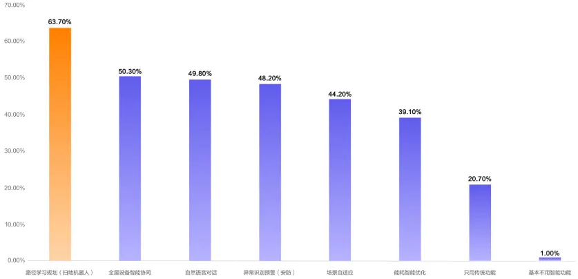 新生态——以智能家居为代表,关注跨设备协同。扫地机器人成为使用率最高的智能家居功能,印证了“刚需驱动”的成功逻辑。
