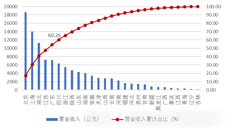 2025中国建筑业企业200强上榜企业营业收入的地区分布如图2所示。从图中可以看出,北京、上海、湖北、江苏、广东、四川上榜企业实现的营业收入排在前6位,这6个地区上榜企业实现的营业收入占200强入选企业的60.26%。