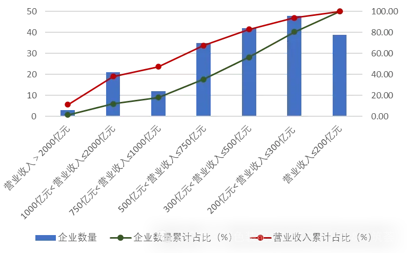 从200家上榜企业的营业收入分布看,不同营业收入水平企业的数量分布及其营业收入占上榜企业总营业收入的比重情况,如图3所示。
