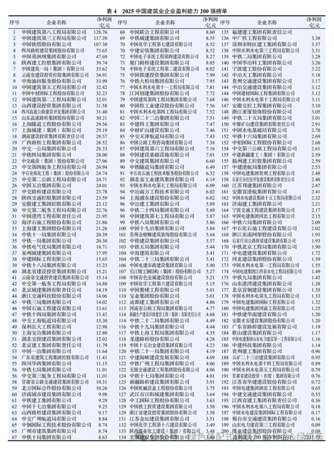 根据满足入选条件的256家企业的净利润数据,得到入选2025中国建筑业企业盈利能力200强榜单的各个建筑业企业所在的位次,如表4所示。