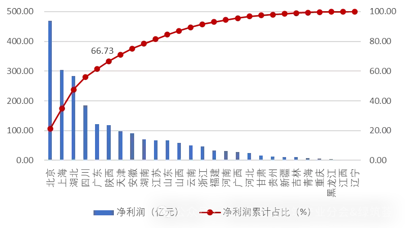 2025中国建筑业企业盈利能力200强上榜企业实现净利润的地区分布如图5所示。从图中可以看出,北京、上海、湖北、四川、广东和陕西上榜企业实现的净利润排在前6位,这6个地区上榜企业的净利润占200强入选企业的66.73%。