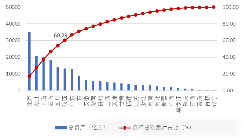 2025中国建筑业企业资产总额200强上榜企业拥有资产总额的地区分布如图7所示。从图中可以看出,北京、湖北、上海、云南、四川排在前5位。这5个地区上榜企业拥有的资产总额占资产总额200强的60.29%。