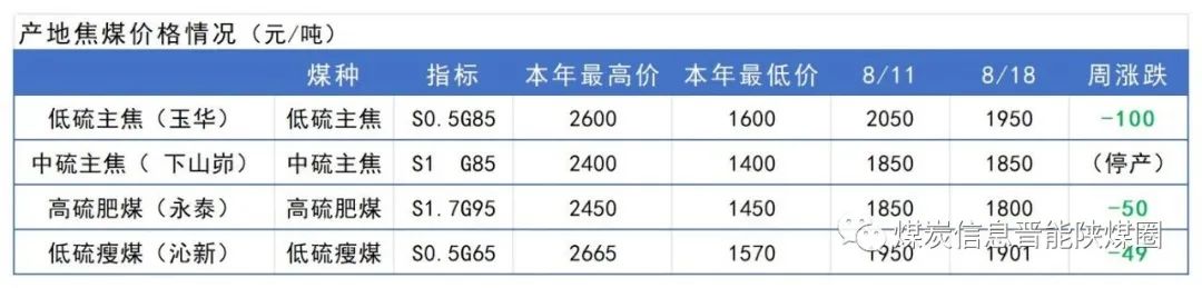本周炼焦煤市场情绪转差,网络竞拍价格下跌明显,流拍增加,线下煤矿报价随之走弱。据淘煤网最新竞价数据显示,灵石地区低硫主焦精煤(S0.95,A12,V30,G95)起拍价1850元/吨,成交价格1858元/吨,较上期8月8日成交均价下跌67元/吨;临汾地区低硫主焦原煤(S0.5,A8,V23,G86,回收27)起拍价750元/吨,成交价格787元/吨,较上期8月12日成交均价下跌15元/吨;吕梁地区低硫主焦原煤(S0.45,A7.5,V22,G91,回收20)起拍价590元/吨,成交价格595元/吨,较上期8月12日成交均价基本持平。