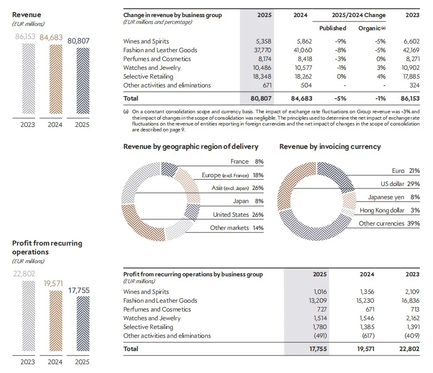 LVMH集团2025年财报呈现出一种复杂的图景:整体业绩承压,但各业务部门表现分化明显。