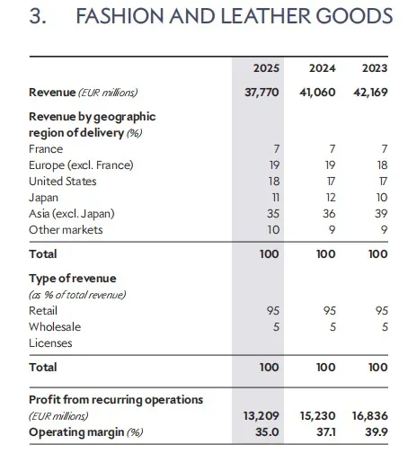 不过,深入分析不同业务板块的表现,却能发现隐藏在整体下滑背后的结构性亮点。作为集团最大收入来源的时装皮具部门(包括路易威登和迪奥等)全年内生性收入下降5%至377.7亿欧元,经常性经营利润同比下降13%。