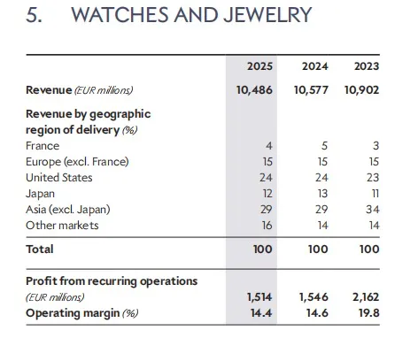 对比之下,钟表珠宝部门的表现则较为亮眼。2025年第四季度,该部门收入环比增长32.7%;全年内生性收入增长3%,经常性经营利润仅小幅下降约2%。