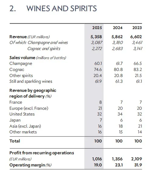 而葡萄酒与烈酒部门是2025年受创较为严重的板块。受汇率波动、需求放缓等因素影响,板块业绩大幅下滑。2025年全年营收53.58亿欧元,有机同比下降5%,经常性经营利润更是大幅下滑25%至10.16亿欧元,成为拖累集团整体业绩的主因。