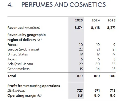 香水与化妆品部门则保持稳定,经常性经营利润为7.27亿欧元,与2024年相比增长8%,营业利润率提升至8.9%。集团强调Dior、娇兰等品牌的新品推动了盈利能力改善。