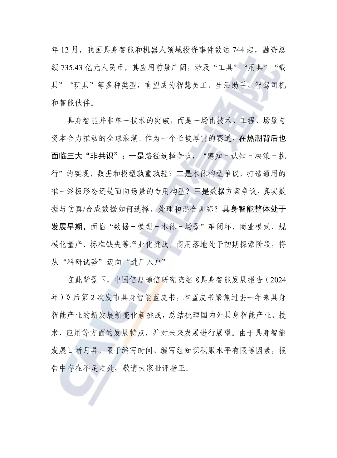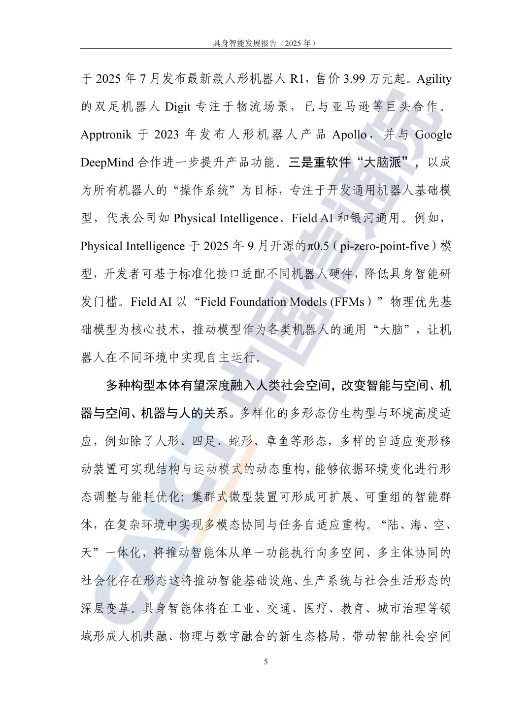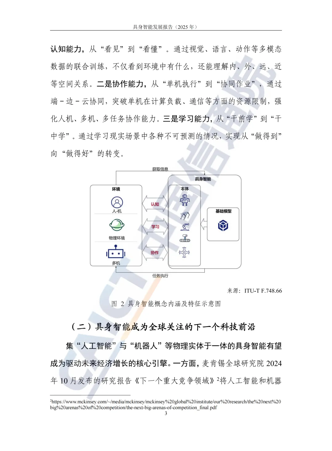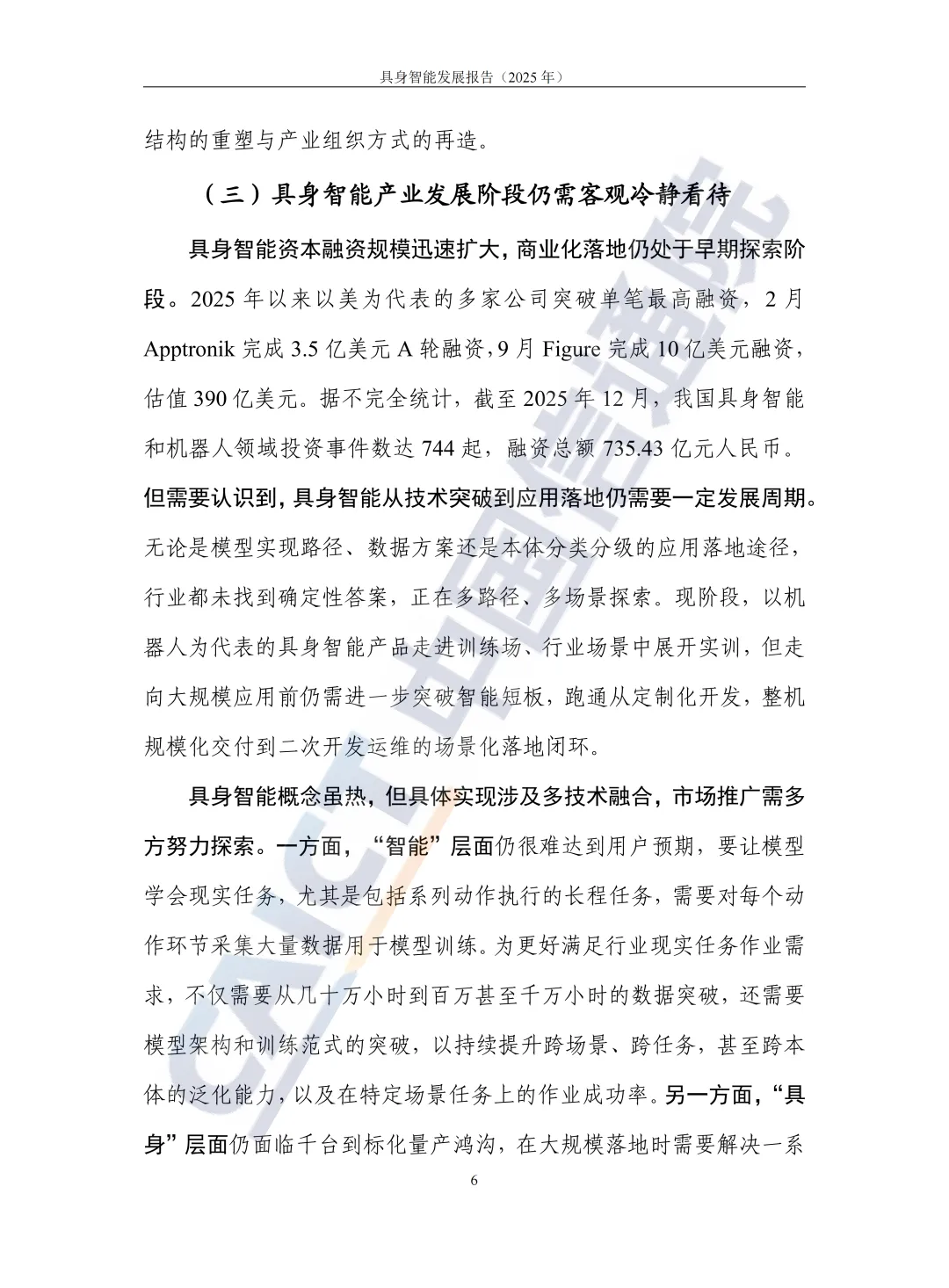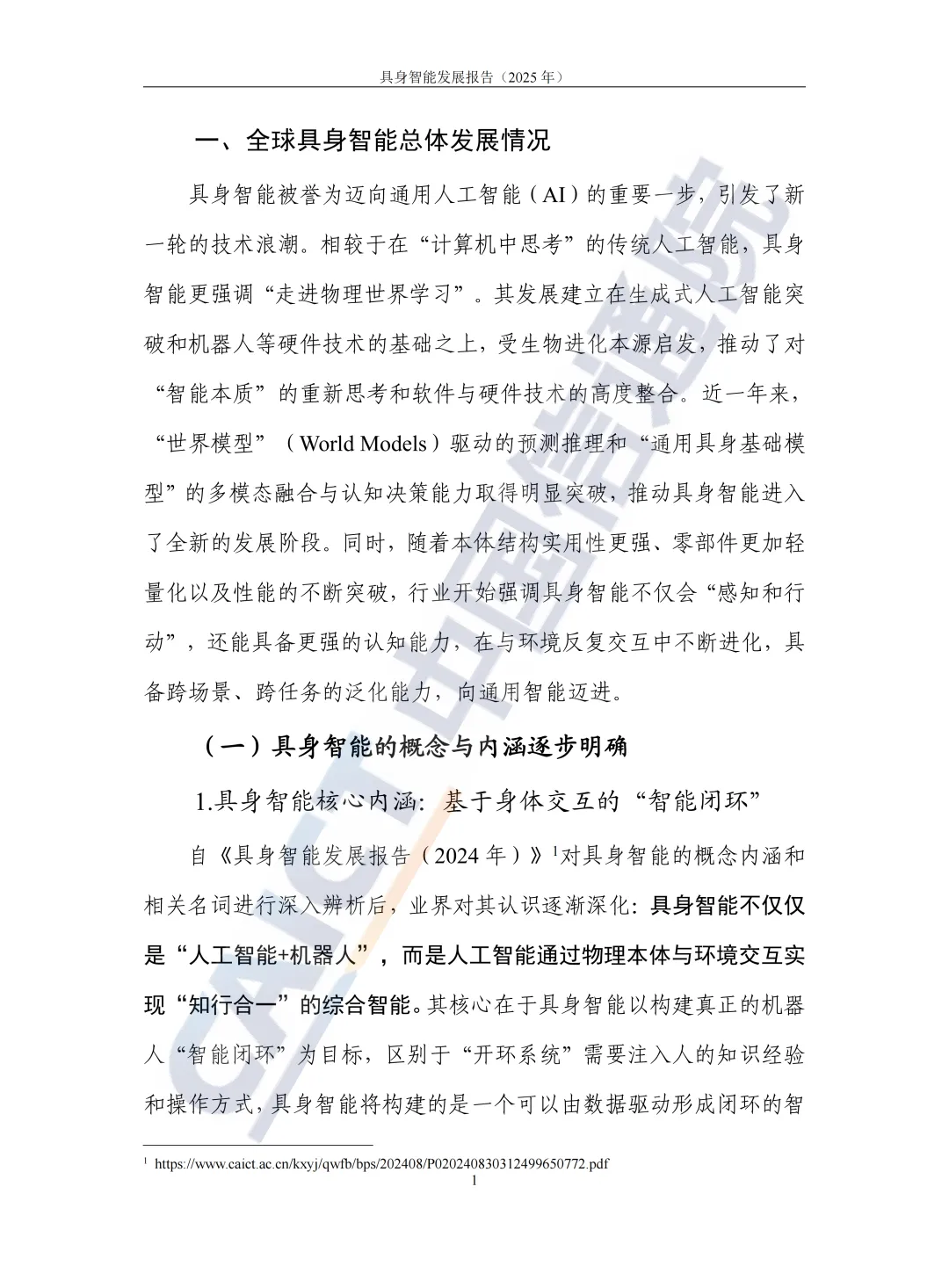 具身智能被誉为迈向通用人工智能(AI)的重要一步,引发了新一轮的技术浪潮。相较于在“计算机中思考”的传统人工智能,具身智能更强调“走进物理世界学习”。其发展建立在生成式人工智能突破和机器人等硬件技术的基础之上,受生物进化本源启发,推动了对“智能本质”的重新思考和软件与硬件技术的高度整合。近一年来,“世界模型”(World Models)驱动的预测推理和“通用具身基础模型”的多模态融合与认知决策能力取得明显突破,推动具身智能进入了全新的发展阶段。同时,随着本体结构实用性更强、零部件更加轻量化以及性能的不断突破,行业开始强调具身智能不仅会“感知和行动”,还能具备更强的认知能力,在与环境反复交互中不断进化,具备跨场景、跨任务的泛化能力,向通用智能迈进。