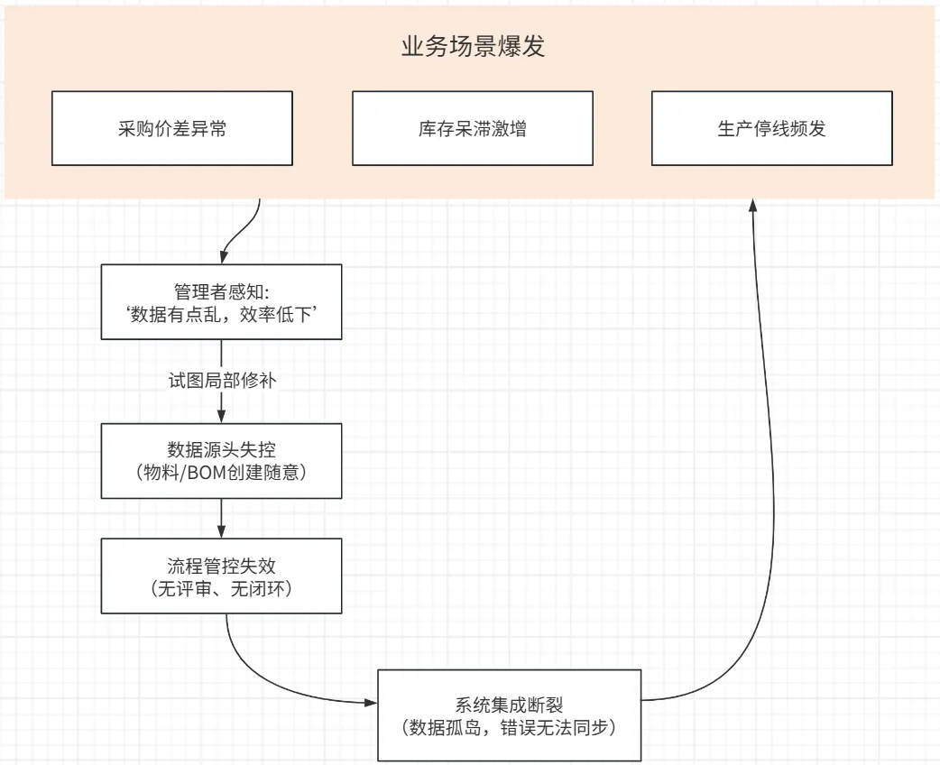 问题的传导,严格遵循 “一体两翼”模型:混乱的数据主体(物料、BOM),因失效的流程之翼而不断产生,又因断裂的集成之翼而无法被纠正,最终形成吞噬效率与利润的闭环黑洞。