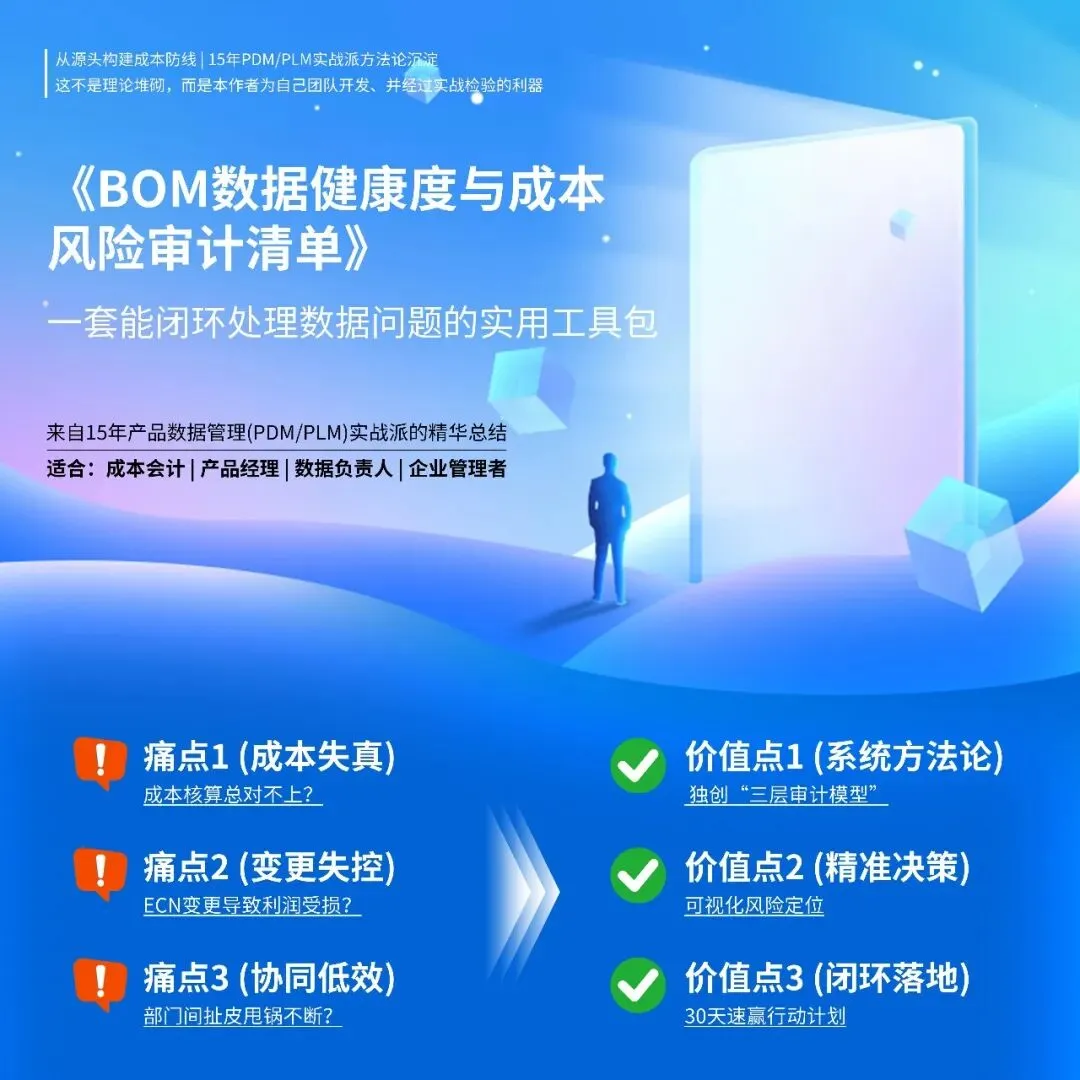 完成一次自查需要方法与工具。为了帮助你快速建立初步认知,我准备了一份易上手版的 《BOM数据健康度与成本风险审计清单》 ,涵盖物料、BOM、流程的多个关键问题。你可以用它发起一次内部的快速扫描。