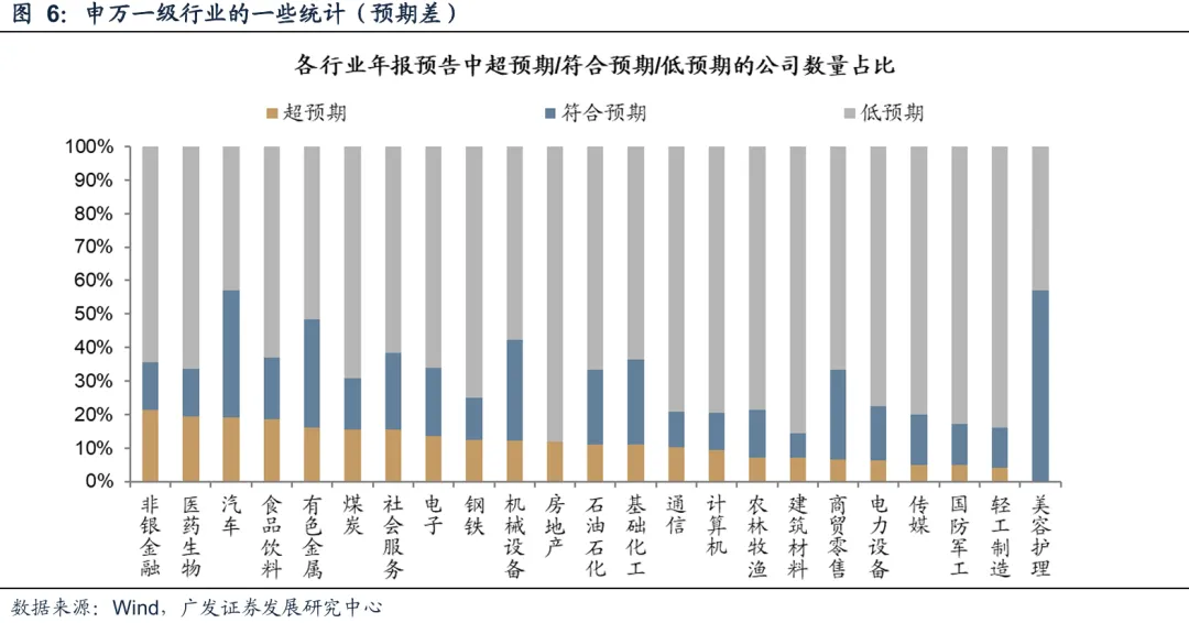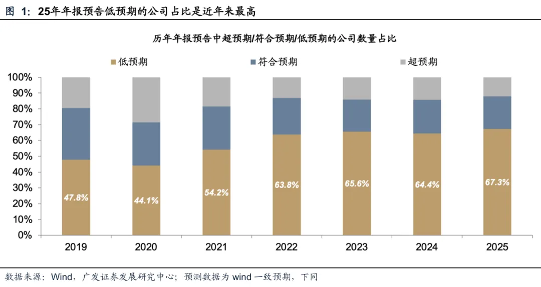 总量看,25年年报预告压力仍较大。低预期、亏损或负增公司数量占比均较24年再创新高。