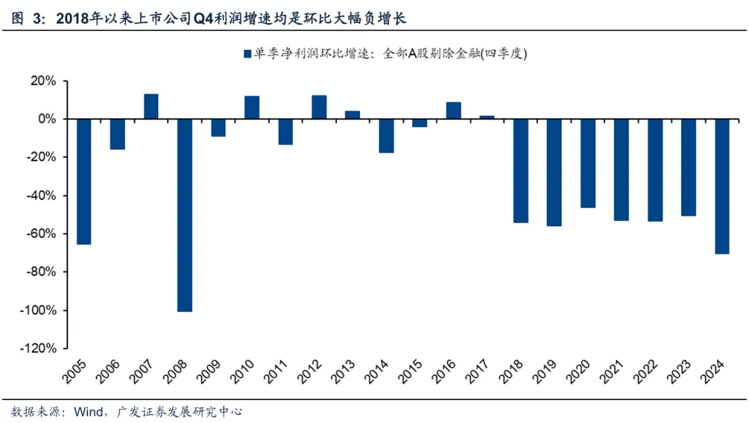 事实上,2018年开始,上市公司在Q4都有大量洗报表行为。下图可见,2018年之后,受到减值、缴税、发奖金等诸多因素影响,上市公司Q4利润均是环比大幅负增长。