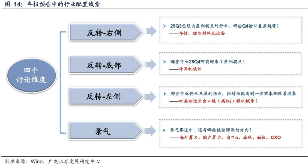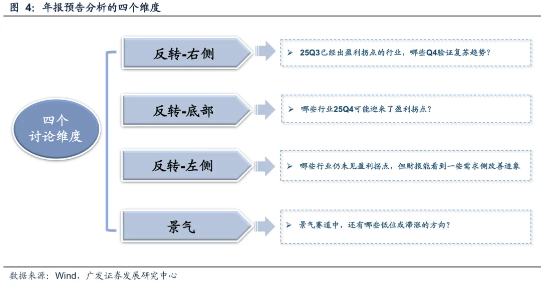 策略视角分析年报预告,我们更多基于周期的维度。主要基于25Q3各行业的经营位置,通过25Q4的边际变化,关注四个方面——