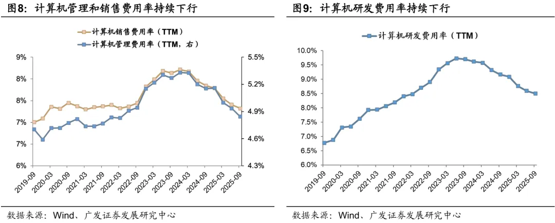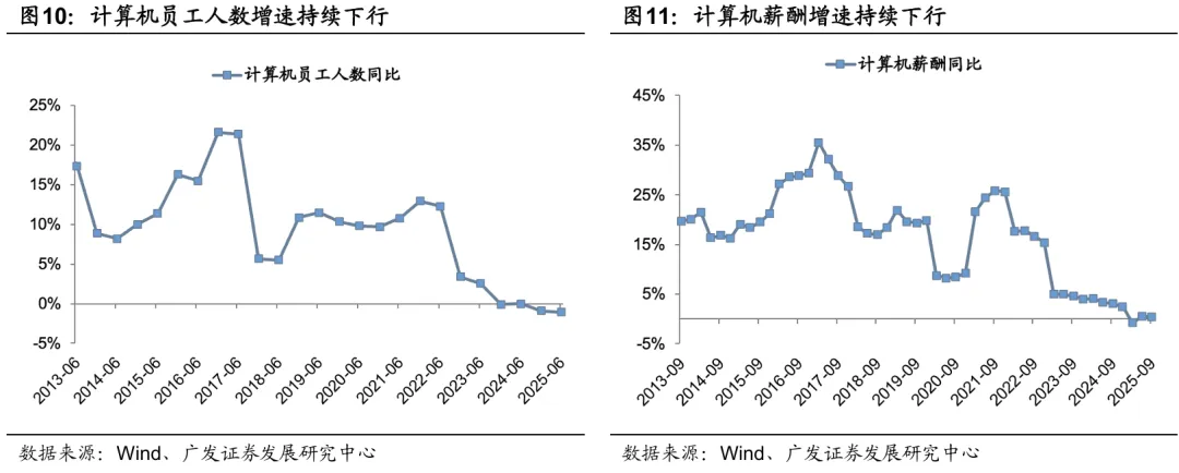 计算机的盈利拐点部分源于前期费用和人员的持续收缩。也是一种程度上的“产能出清”。可以用供给出清+需求改善框架看。截至25Q3,计算机的员工同比负增长、薪酬同比接近负增长(在历史底部)、费用率持续下行。