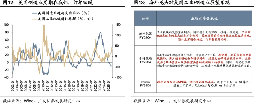 反转策略③:偏左侧视角,哪些行业仍承压,但财报可看到部分需求侧改善的迹象?主要是对美制造业出口链。从已披露公司看,出口链Q4业绩大概率有压力,源于汇率升值、关税、需求等。向前看,当前美国制造业建造支出在历史底部,而工业机械订单已持续改善。最新FY25Q4北美财报中,TI、卡特彼勒均提到北美工业/制造业复苏的趋势,源于数据中心建设、IIJA法案、基建项目推动等。特斯拉也大幅加大CAPEX,反应制造业回流趋势。26年北美需求改善可以期待。