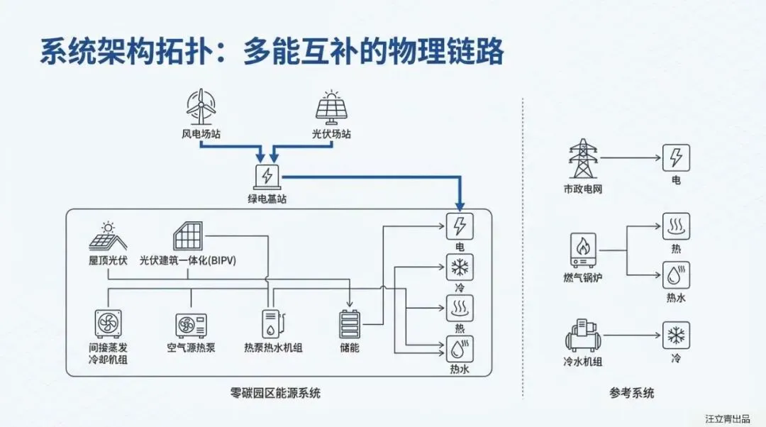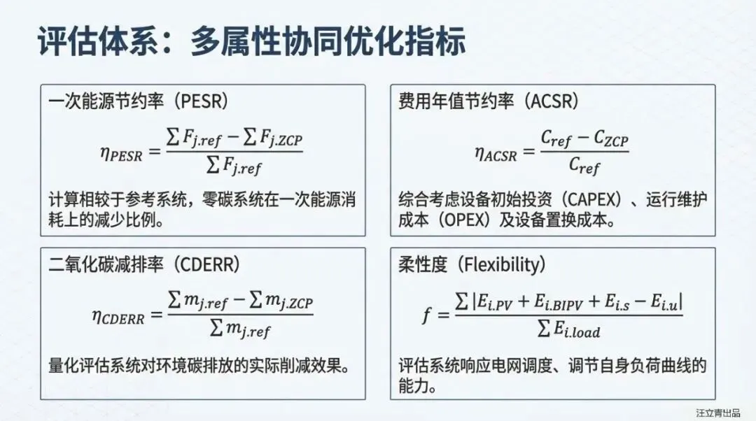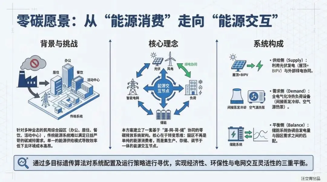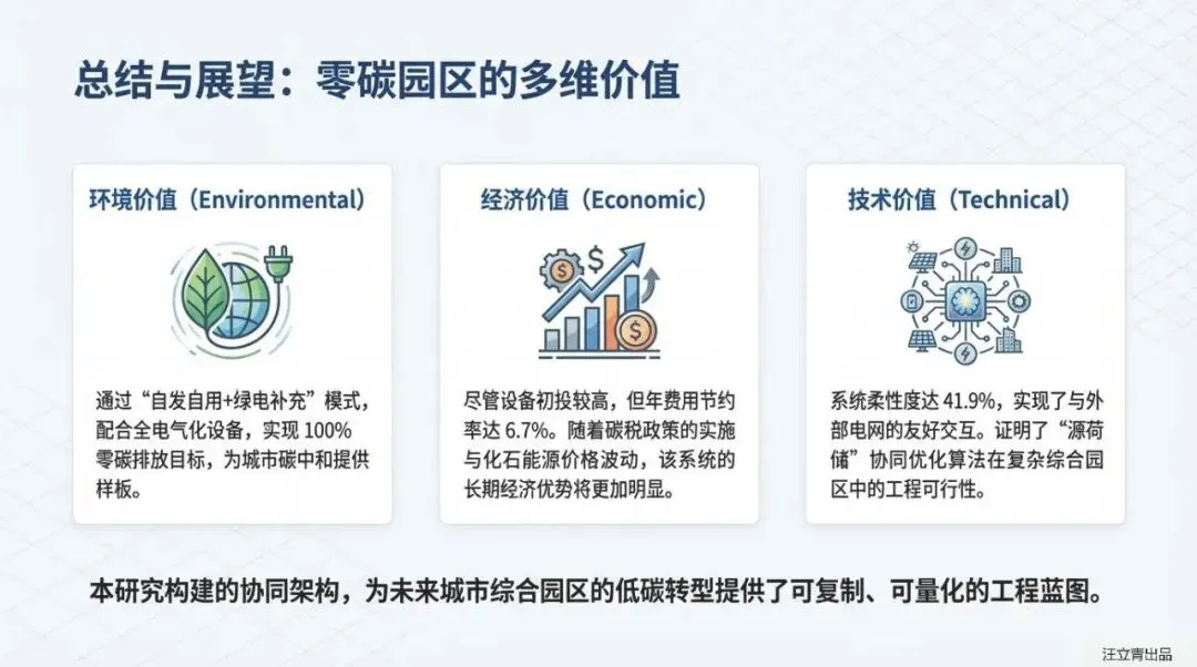 零碳园区建设往往面临“环保虽好,钱包难保”的质疑。这份针对办公、居住、餐饮多业态园区的研究报告,通过建立精细化的动力学模型,直接对比了“零碳系统”与传统“市电+燃气锅炉+冷水机组”参考系统的各项指标。结果令人振奋:通过全电气化改造与多能互补,园区不仅能甩掉化石能源的包袱,还能在经济账上实现逆袭,**年费用节约率达到6.7%**,证明了绿色转型具备真实的商业生命力,,。
