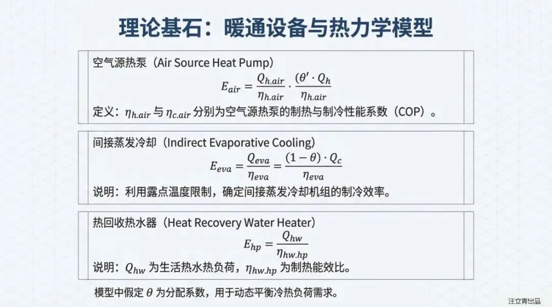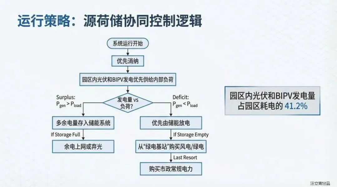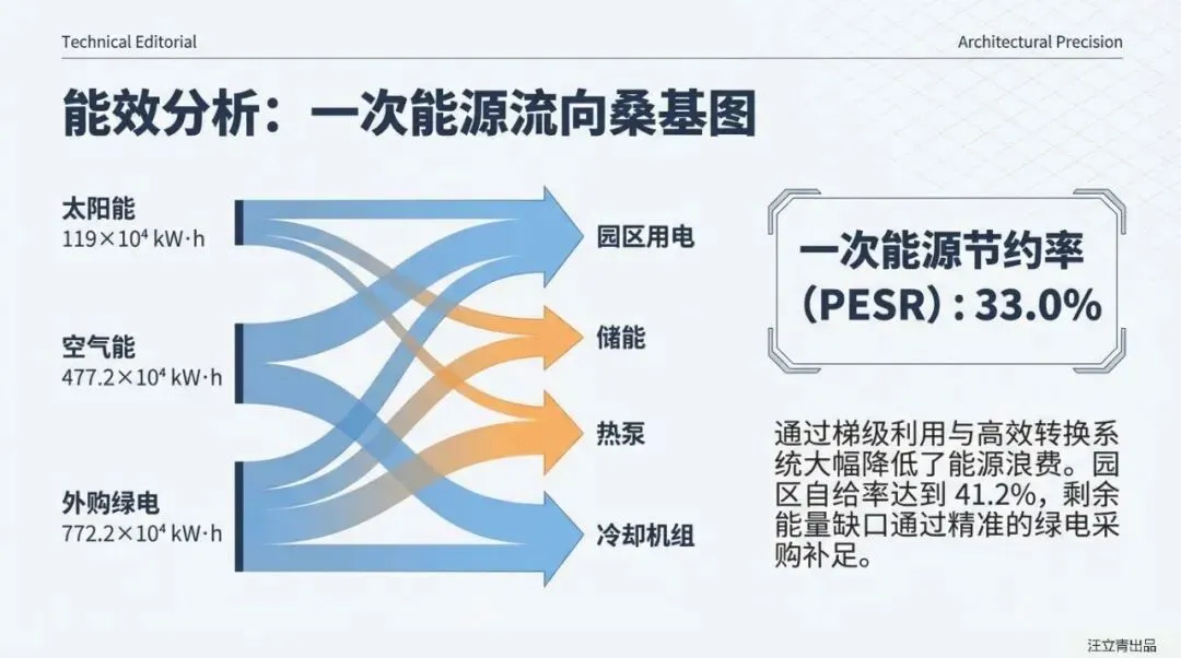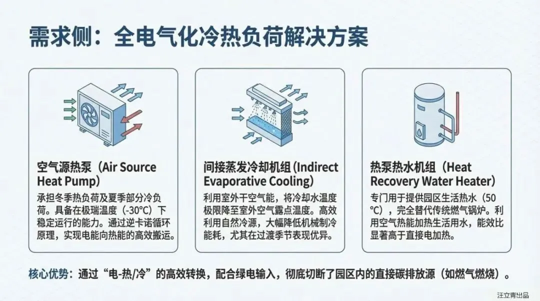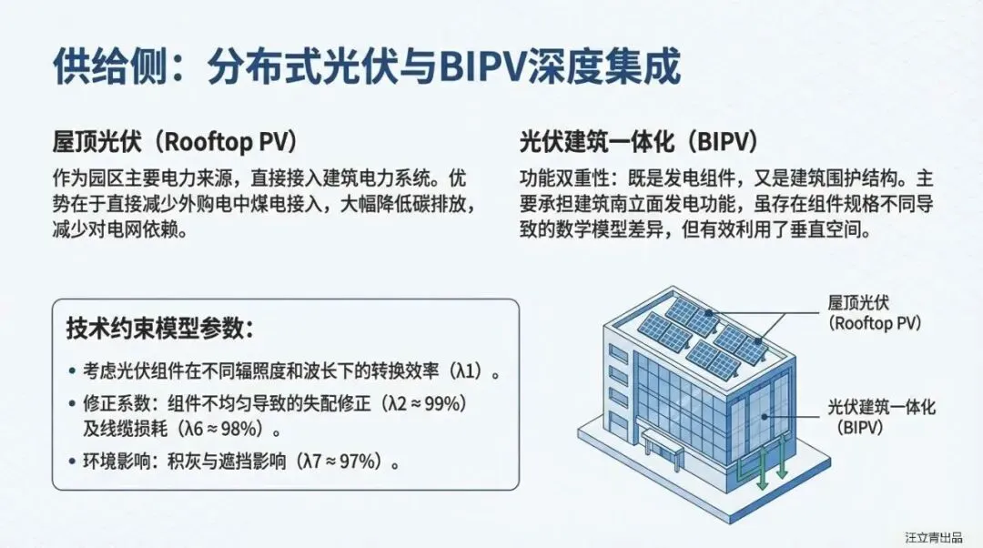 这套系统的“杀手锏”是什么?答案是极致的“全电气化”与“高效冷热耦合”。 报告摒弃了传统的燃气锅炉,构建了由屋顶光伏、光伏建筑一体化(BIPV)、储能、空气源热泵和间接蒸发冷却机组组成的硬核阵容。其中,间接蒸发冷却技术表现尤为抢眼,在过渡季节和夏季通过利用室外干空气势能,承担了园区高达73.9%的冷负荷,极大降低了机械制冷的能耗。同时,光伏系统(含车棚与BIPV)直接覆盖了园区41.2%的用电需求,剩余缺口则通过调度周边的风光绿电或市电补充,彻底实现了供需两侧的灵活匹配。