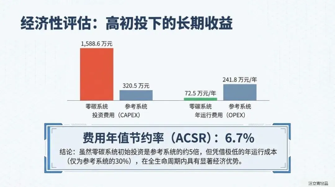 投资回报是绕不开的坎,但运营优势巨大。 虽然零碳系统的初始投资成本约为参考系统的5倍(1588.6万元 vs 320.5万元),主要集中在光伏、储能与热泵设备上,但其**年运行费用仅为参考系统的44%**(69.6万元 vs 158.1万元)。这种“高投入低运行”的模式,使得园区彻底摆脱了对天然气和大部分市电的依赖,规避了能源价格波动的风险。报告测算显示,得益于极低的运营成本,系统最终实现了全生命周期内的成本节约。