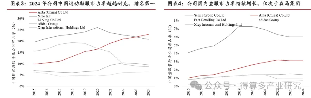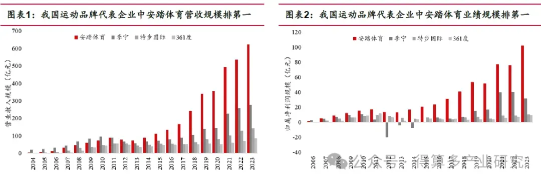 安踏体育凭借前瞻的战略布局精准捕捉市场机会,近年来采取多品牌策略横向扩张成为国内运动服饰行业绝对的龙头。公司于2011 年营收追平龙头、2012~2013 年反转超越、2014~2019 年增速持续领先拉大差距、2020 年至今稳健增长维持龙头地位;当下公司在国内营收、归属利润规模远超同行,市占率排名第一,是中国第一大运动鞋服集团;安踏、FILA 童服市占率持续增长,公司国内童服市占率仅次于森马集团。