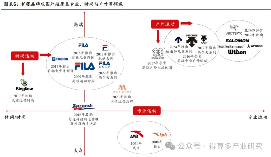 公司战略可以分为四大阶段:1)品牌批发:1991 年创立安踏品牌,以单品牌为主进行经销批发;2)零售转型:2013 年面对库存危机进行零售导向调整,精简渠道结构;3)多品牌扩张:2009 年收购FILA,2015 年前后成功孵化品牌FILA,逐渐培育为公司第二大营收支柱,2016 年正式启动多品牌战略,陆续收购迪桑特、可隆等品牌,寻求新增量;4)全球化布局:2019 年成立财团收购国际体育集团亚玛芬,布局全球;主品牌安踏2023 年出海东南亚,目前已在新加坡、马来西亚多地完成渠道布局。