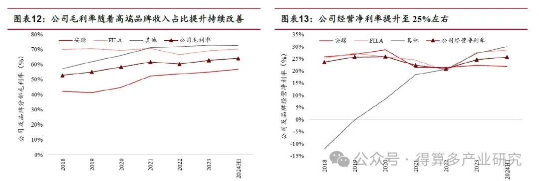 分品牌看,安踏、FILA 发展已然成熟,营收规模贡献较多,2023 年分别实现营收303、251 亿元,同比增长9.3%、16.6%;以迪桑特和可隆为代表的其他品牌分部尽管营收规模较小,但增速喜人、快速扩张中,2019~2023 年营收5-yr CAGR 为40%。
