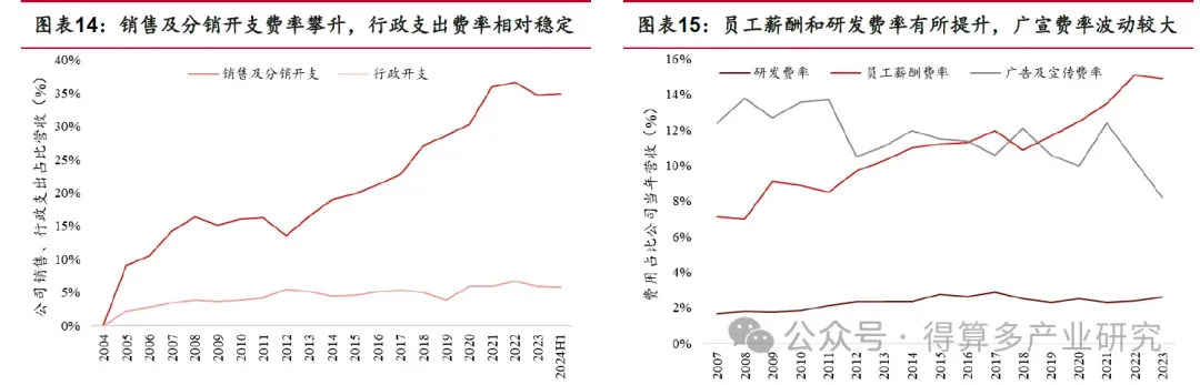 费用方面,销售及分销开支随着公司直营化持续推进,费率持续攀升;行政支出整体保持稳定。具体看,公司员工薪酬支出费率整体有所上升;广宣费用受赛事影响较大,考虑到2024 年为体育大年,预计广宣支出有所提升;研发费率提升至3%左右。