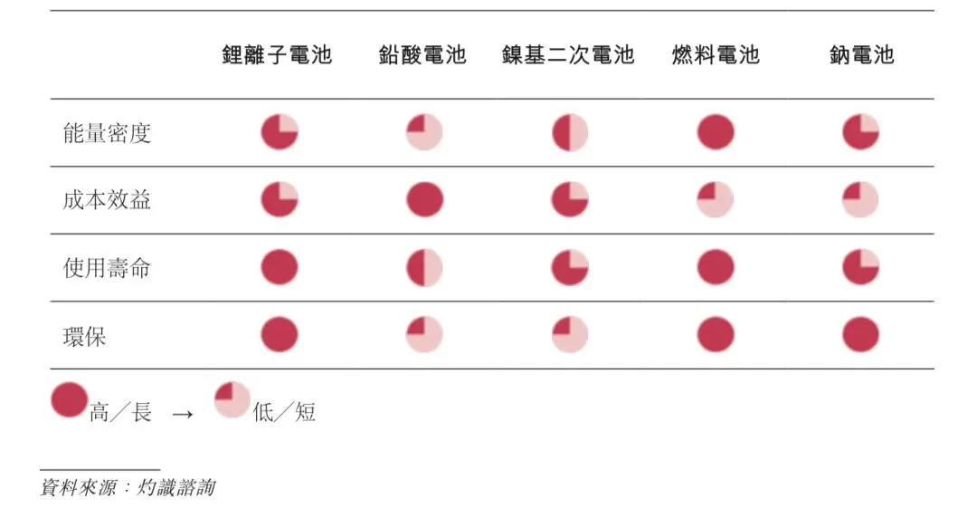 目前,主要的电池技术包括锂离子电池、铅酸电池、镍基二次电池、燃料电池及钠电池。在消费电子产品和电动汽车中,由于在能量密度、循环次数和环保性能方面的限制,传统电池(如铅酸和镍基二次电池)已逐渐被锂离子电池取代,尽管传统电池仍会继续服务于某些细分应用,如作为汽车启动电池、备用电源及数据中心能源存储系统。另一方面,燃料电池及钠电池仍处于早期商业化阶段,仍有大量技术及成本壁垒有待攻克。在各种电池技术中,锂离子电池已成为主导选择,主要是由于其能量密度相对较高、使用寿命较长及对环境的影响较小。下表提供了不同电池技术之间的比较: