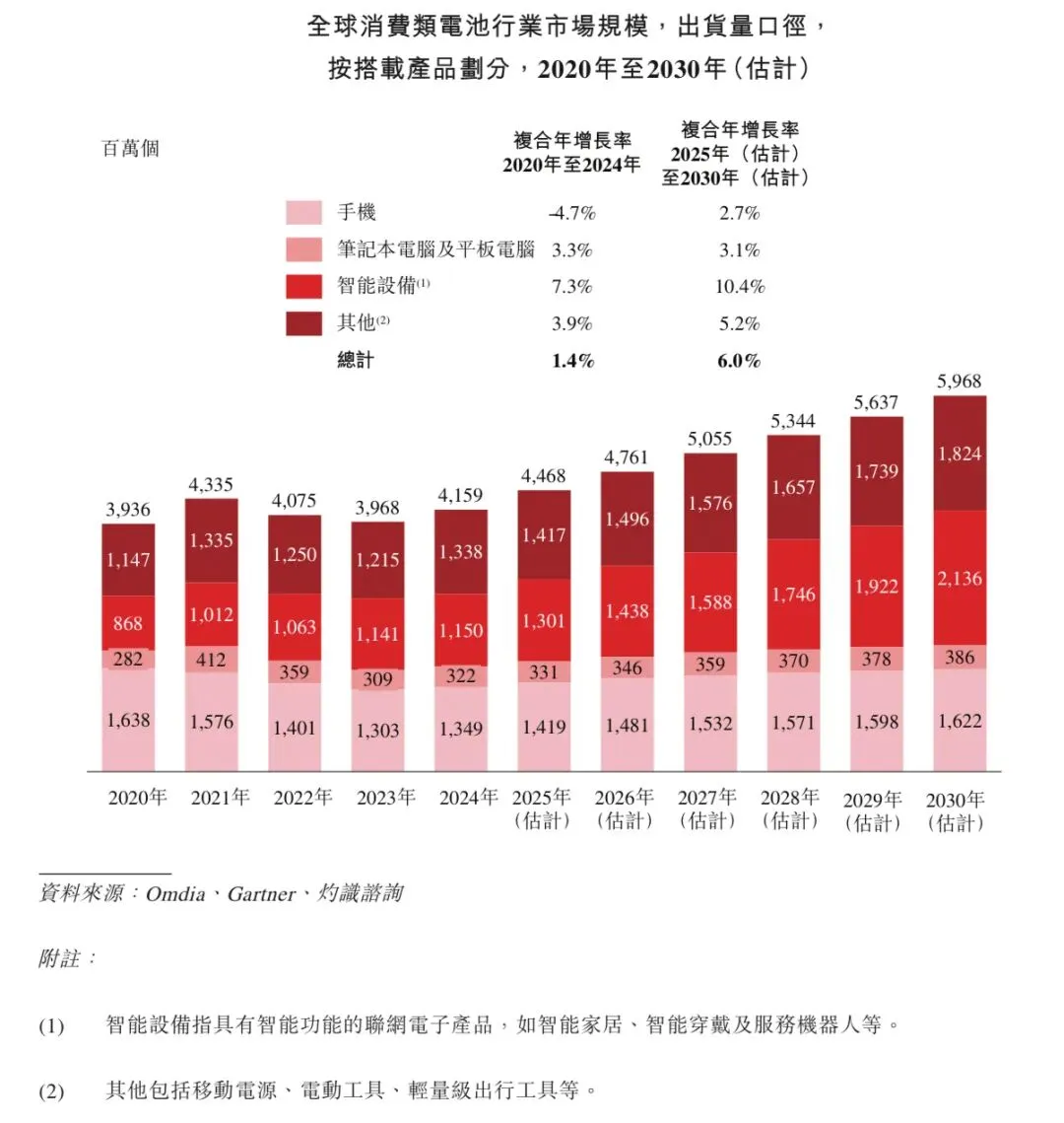 根据灼识咨询的资料,全球消费类电池出货量由2020年的3,936百万个增长至2024年的4,159百万个,复合年增长率为1.4%。于2022年及2023年,市场经历了短暂萎缩,主要原因是手机需求下降,但2024年呈现强劲复甦,并预计由2025年的4,468百万个提升至2030年的5,968百万个,复合年增长率为6.0%。手机、笔记本计算机及平板计算机广泛融入日常生活中,是最常用的消费电子产品,在现代数字化生活方式中发挥核心作用。其中,作为全球出货量最大的消费电子品类,2024年手机电池的出货量达到1,349百万个,占整体消费类电池出货量的32.4%。