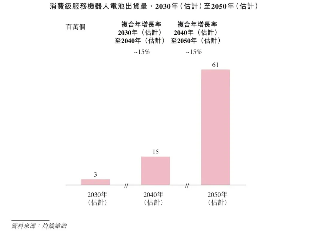根据灼识咨询的资料,全球消费级服务机器人电池出货量预计将从2030年的3百万个增长至2040年的15百万个,复合年增长率约为15%,并将于2050年进一步达到61百万个,2040年至2050年的复合年增长率约为15%。