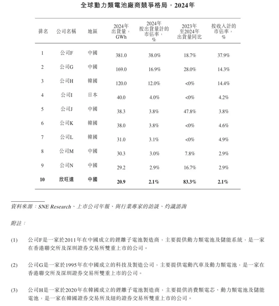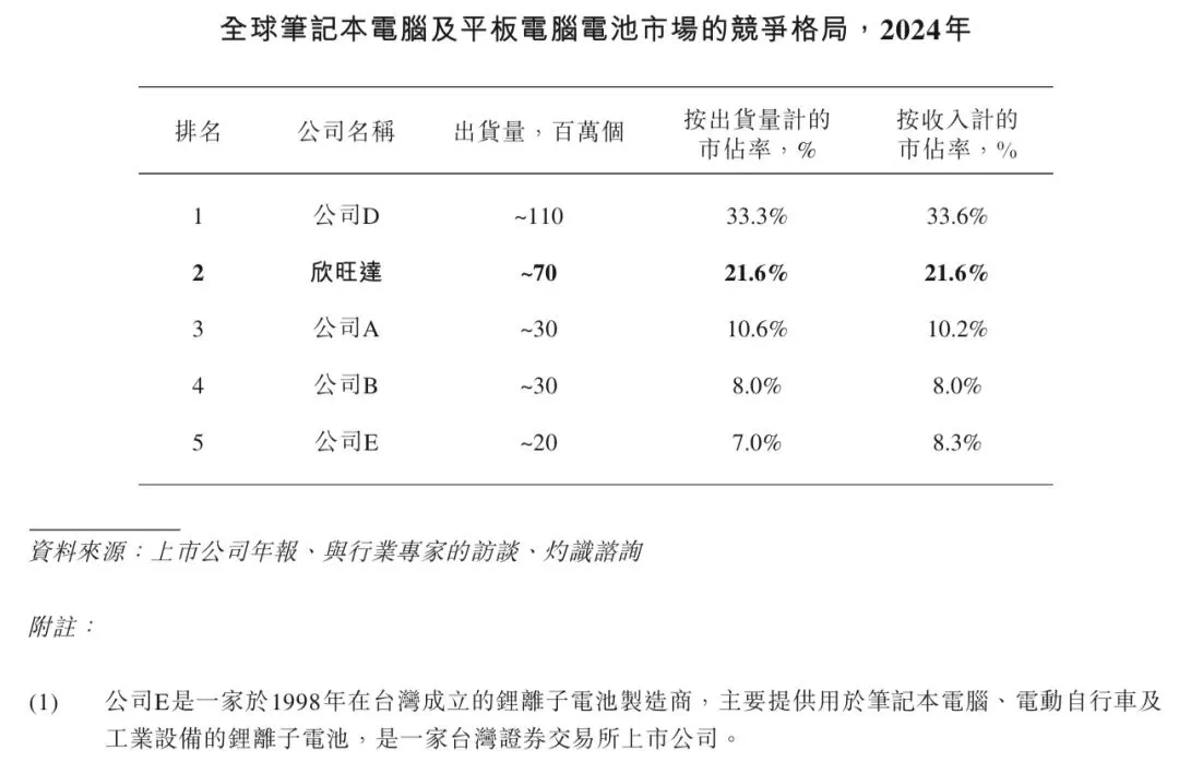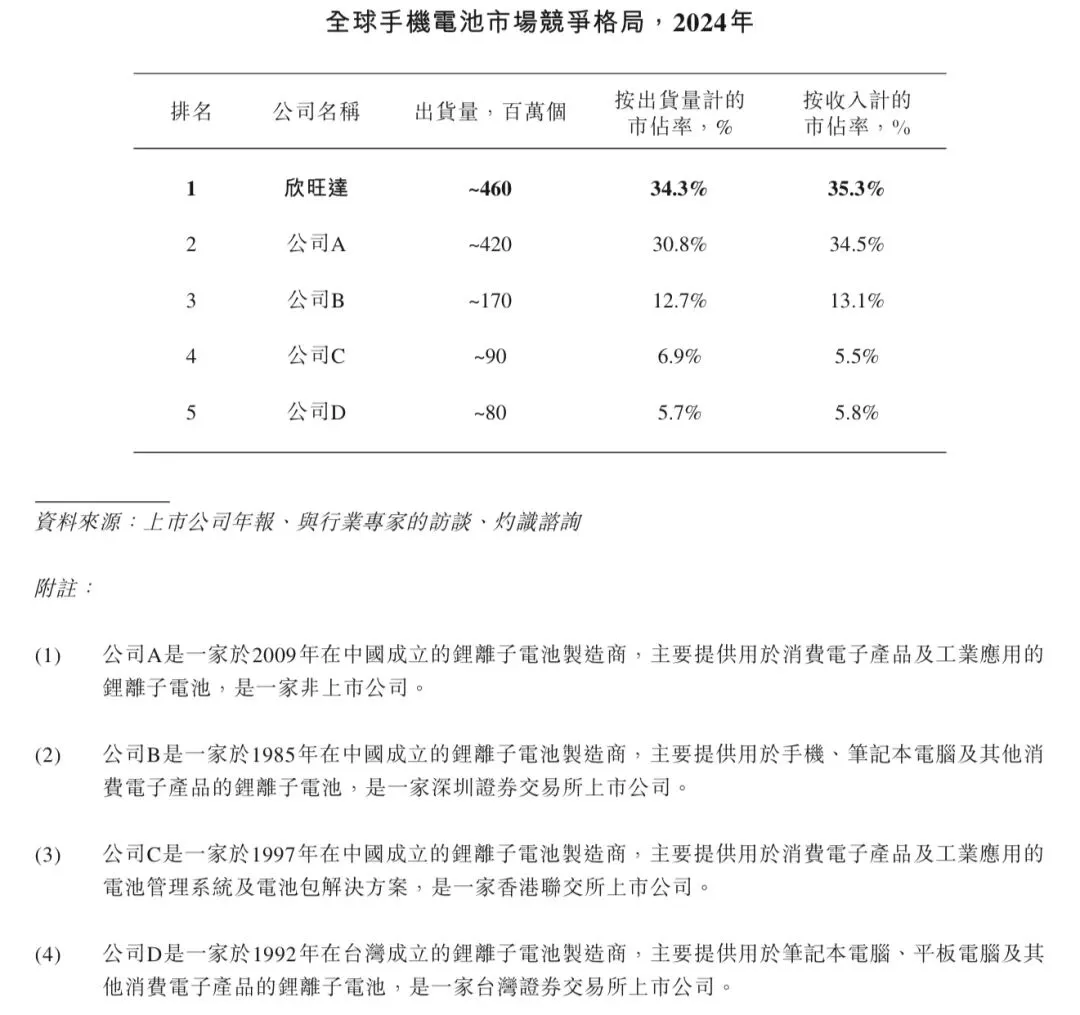 于2024年,欣旺达全球手机电池总出货量为460百万个,市占率34.3%,是全球最大的手机电池厂商。此外,欣旺达全球笔记本计算机及平板计算机电池总出货量为70百万个,市占率21.6%,是全球第二大的笔记本计算机及平板计算机电池厂商。同时,按2024年的收入计,欣旺达亦是最大的手机电池厂商及第二大笔记本计算机及平板计算机电池厂商,市占率分别为35.3%及21.6%。下表载列2024年全球手机和笔记本计算机及平板计算机电池市场的竞争格局。