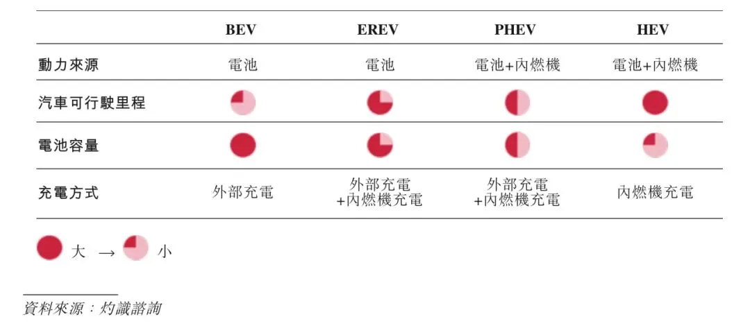 动力类电池是可充电锂电池系统,是新能源汽车(NEV)的主要动力来源。按动力类型划分,新能源汽车可以分为纯电动汽车(BEV)、增程序电动汽车(EREV)、插电式混合动力汽车(PHEV)及混合动力汽车(HEV)。下表说明不同动力类型之间的差异,以及针对每种类型量身定制的动力类电池特征。